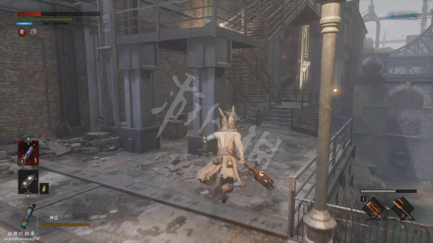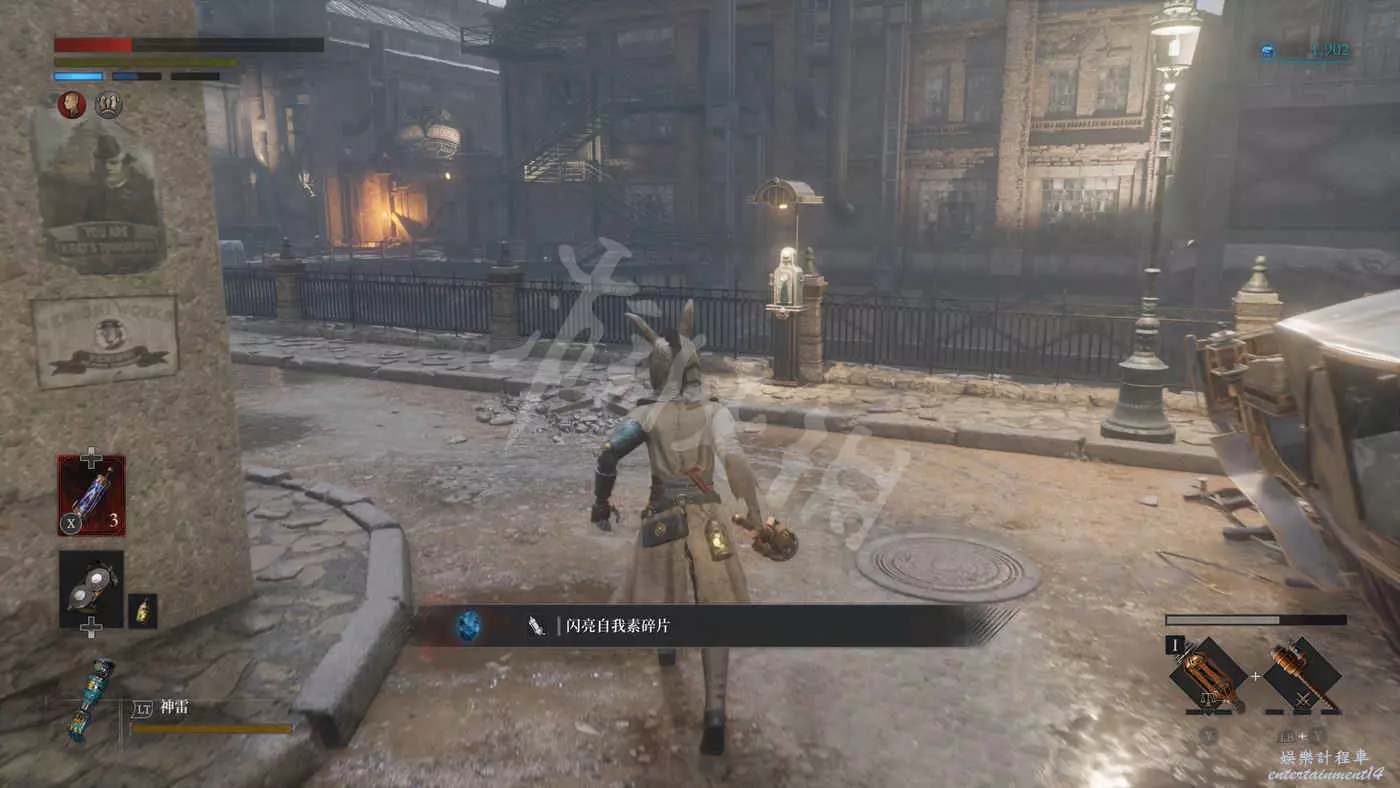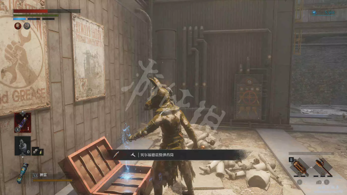 穿過後巷再走過一座橋,在左拐下樓梯之前,可以進入黃色建築旁邊的屋子裡(門會被屋裡的怪破壞掉),打開保險櫃拿到裝備【巨弧重型骨架】。