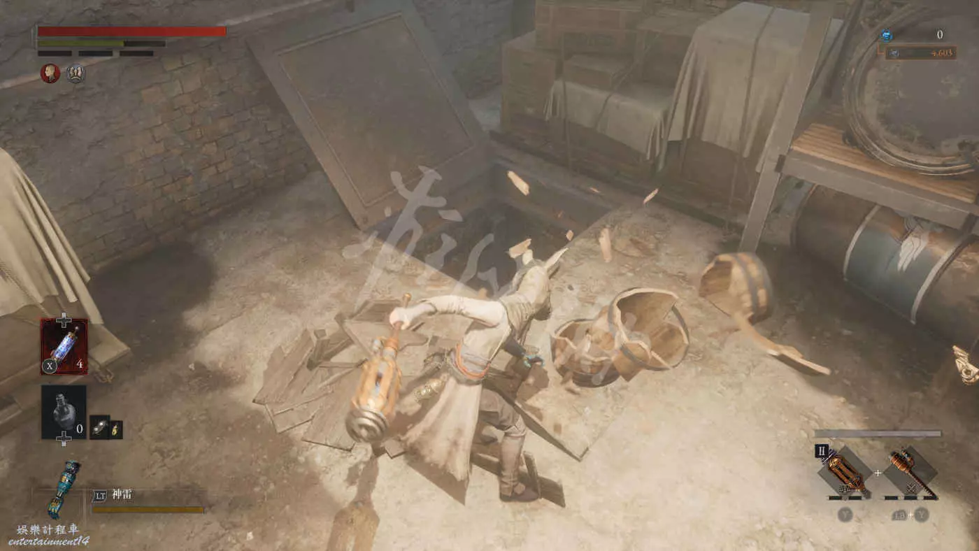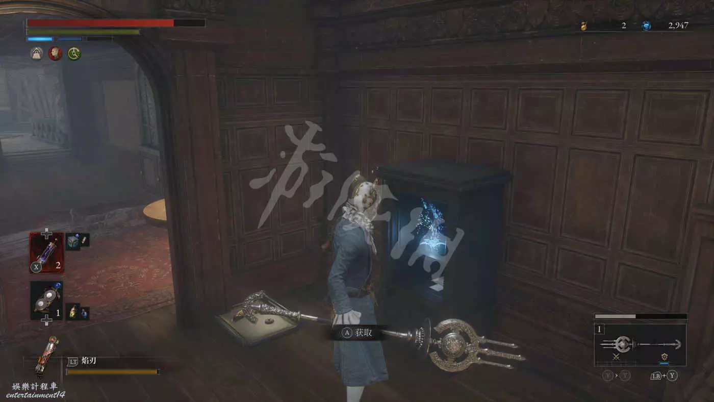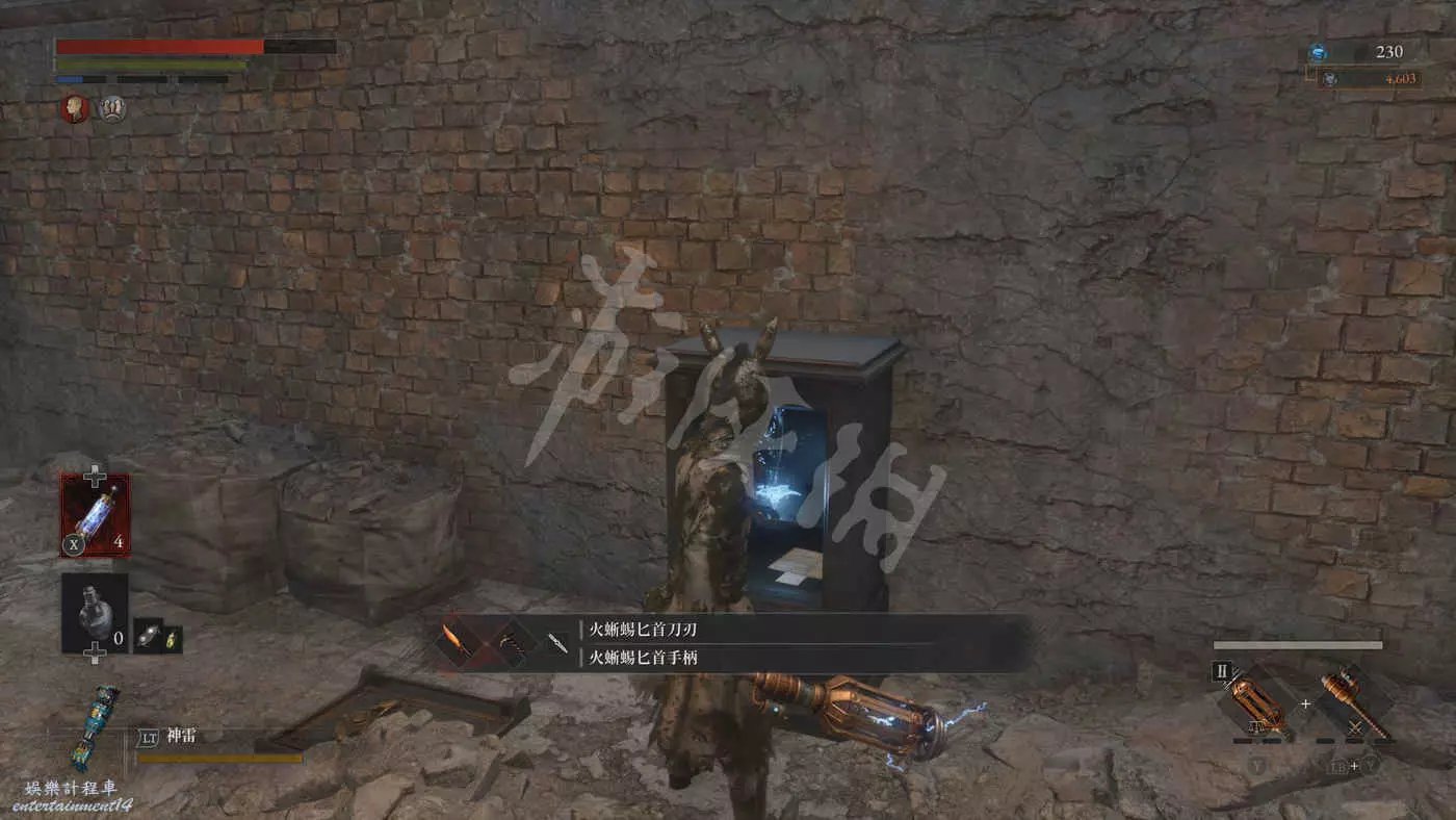 在有雙面大人偶的房間裡還有一個大寶箱,打開後拿到武器【爆炸鎬】。