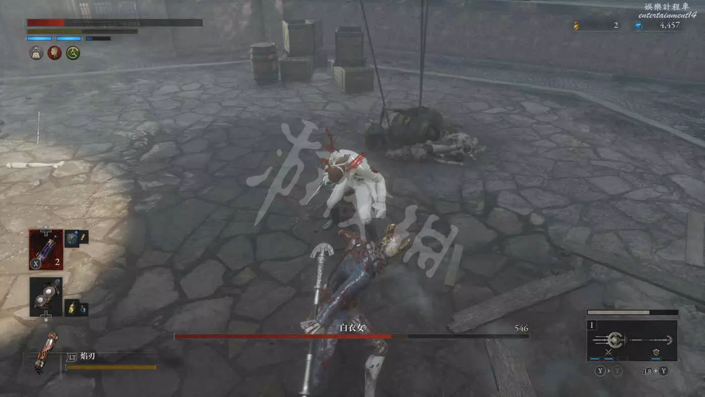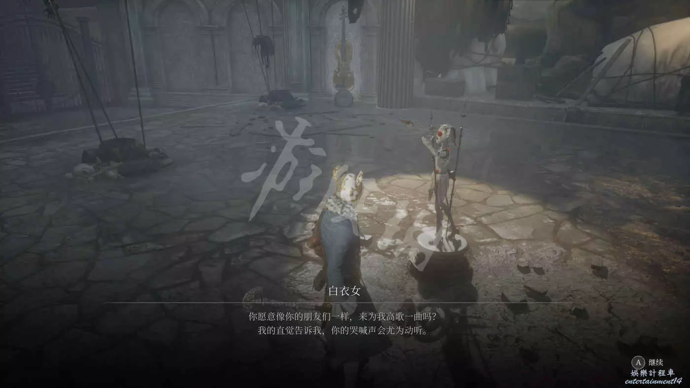 比較好打的一個Boss,可以通過完美格擋來破壞她的刺劍,這樣能大幅削減她的戰鬥力。有一個蓄力很長的紅怒招式,可以不用理她,直接跑遠等突刺過來再反擊就好。擊敗Boss以後獲得【白衣女的吊墜】以及【白衣女面具】。