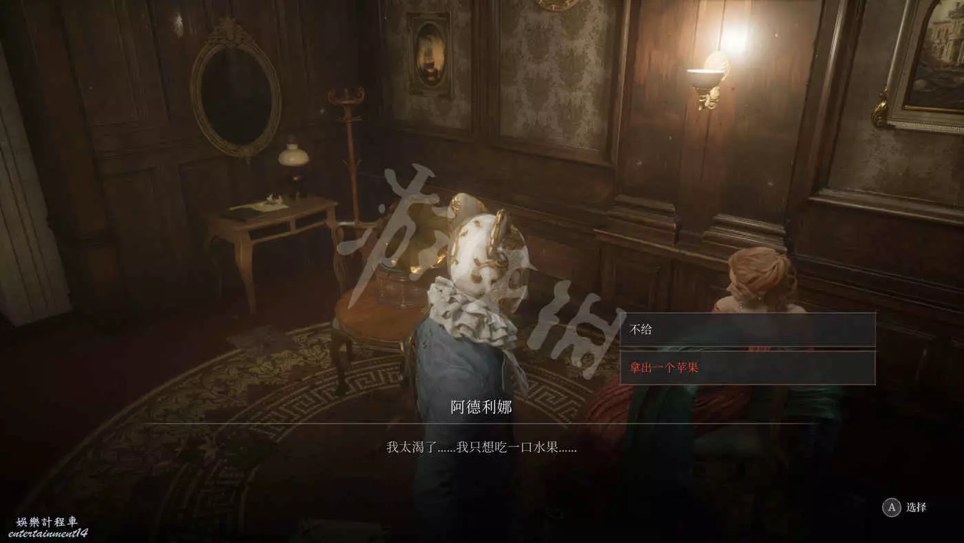 來到二樓的演員休息室(休息室對面路盡頭有個大寶箱,可以拿到一個裝備)見到知名演員阿德利娜,對話得知她想吃水果,回酒店找前臺買【蘋果】,然後把【蘋果】交給阿德利娜。