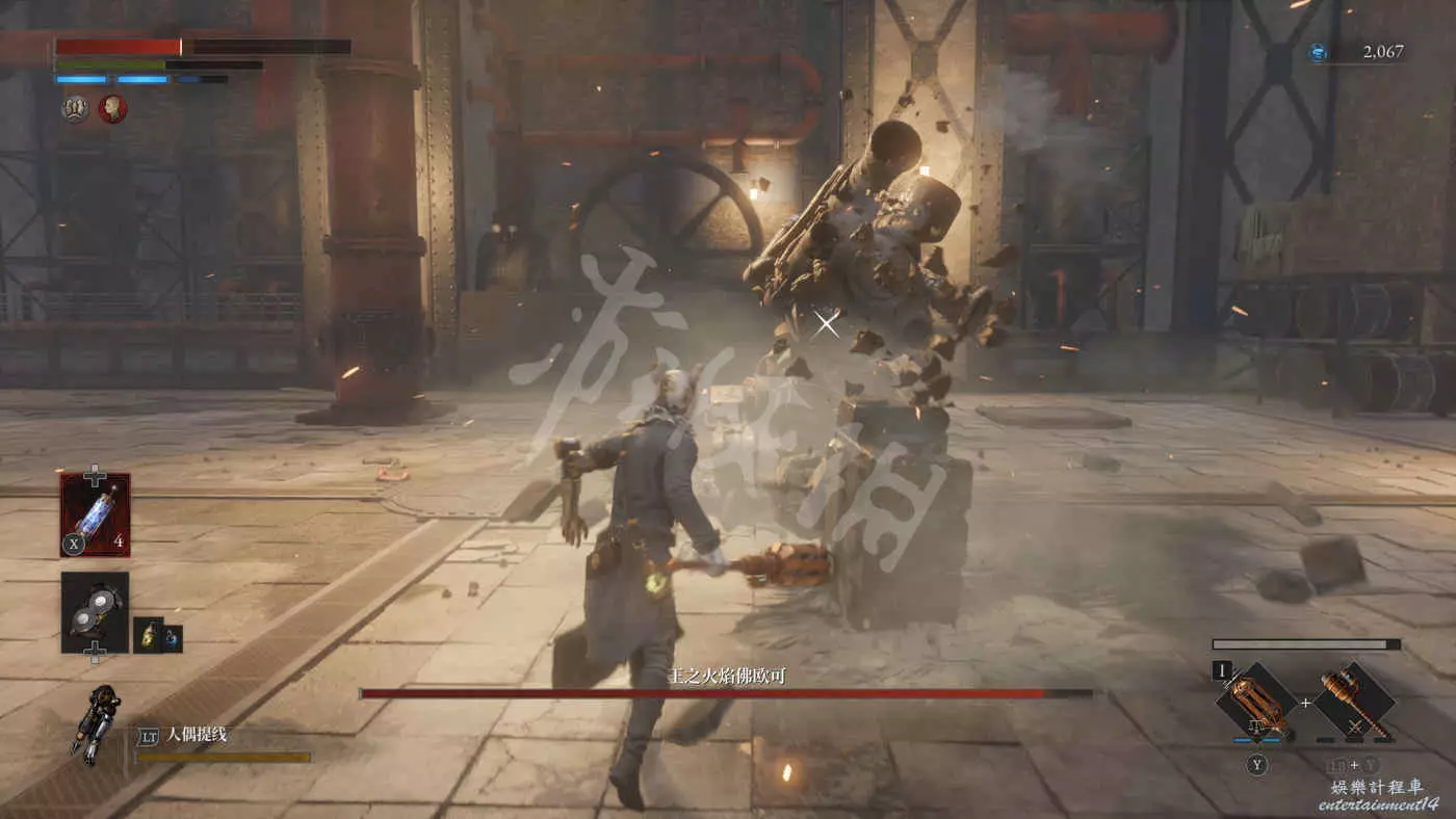 另外戰鬥中尤其要注意Boss只舉起右手時,迅速後撤兩到三次拉開身位,防止自己被抓取技抓到(傷害很高)。