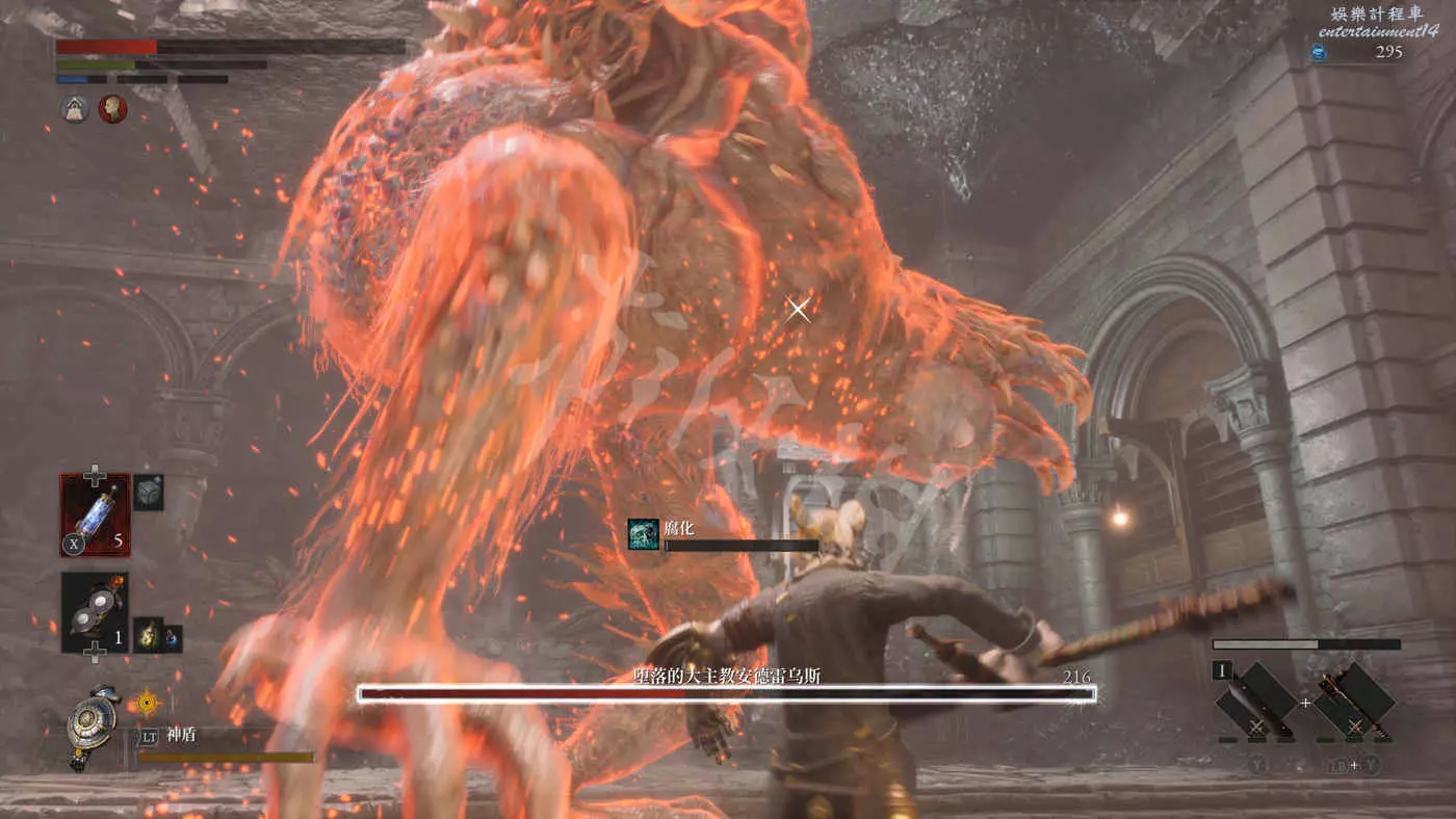 60%血後會加入一套火舞旋風,節奏對了可以接下這一套連招,合理控制耐力的話也不會被一套連死,拉遠距離並不是明智選擇(踏前斬會迅速拉近距離)。