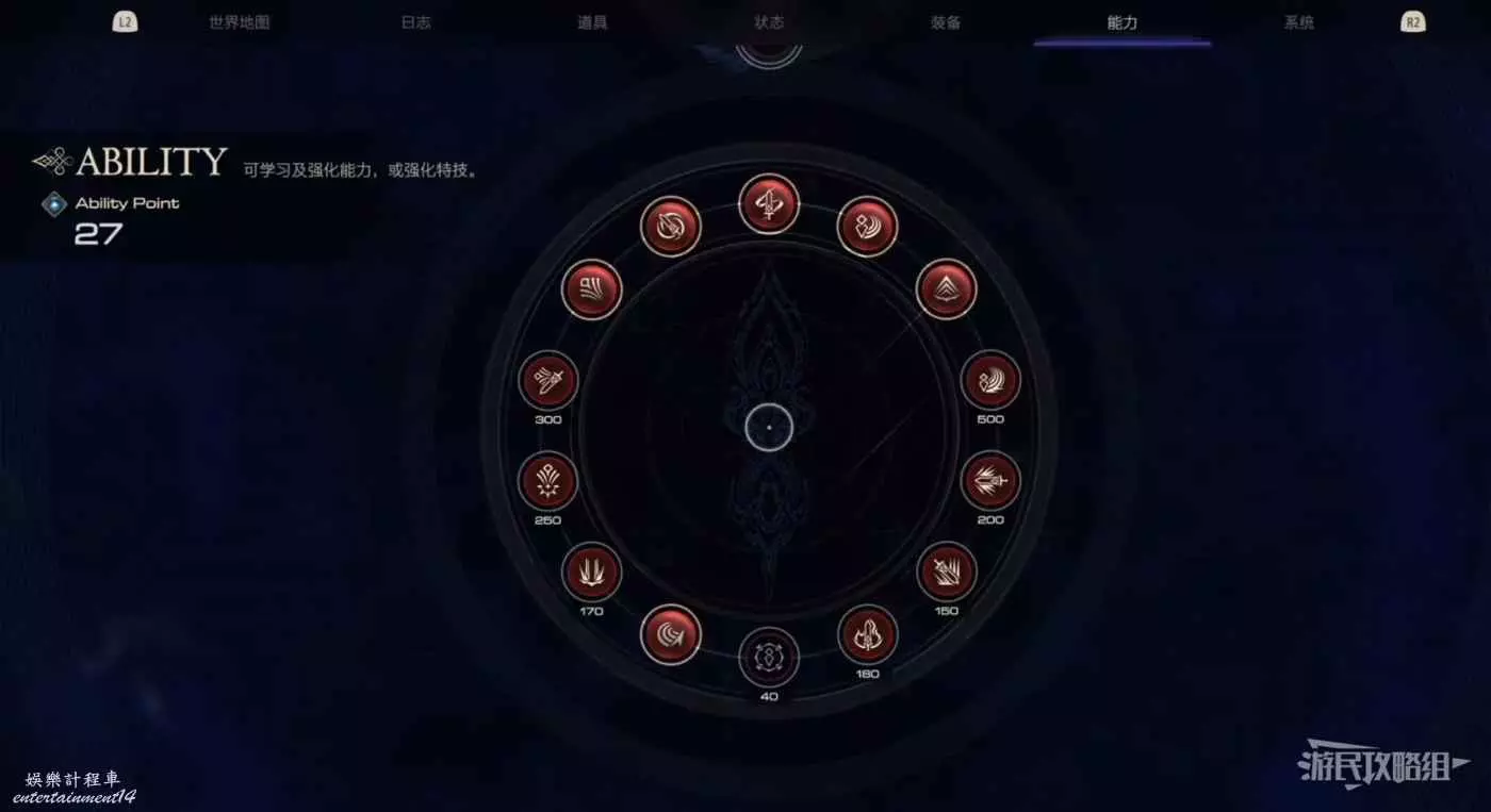 在能力功能表中,玩家可以消耗能力點數(AP)來學習或強化能力和特技。能力點數可以隨時重置並重新分配。