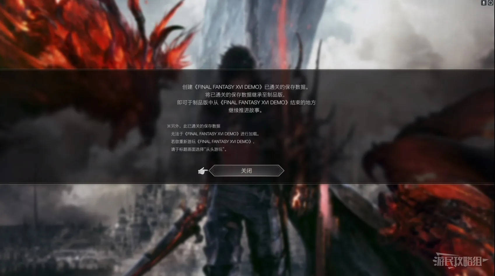 Final Fantasy XVI (太空戰士 16) 存檔繼承方法 17 6 月 2023-06-17 廣告 作者:瑞破受氣包 來源:遊民星空 FF16的試玩版遊玩時間大概有2個半小時左右,此部分內容與正式版完全相同。 試玩版的存檔是可以繼承到正式版的。購買正式版之後即可從試玩版的後續開始遊玩(在標題介面選擇繼續遊玩即可)。 需要注意的是,試玩版通關後會開啟特殊模式【召喚獸動作 戰鬥體驗】,此特別模式只在正式版中有,其中的玩家狀態為此模式專用,不會繼承至正式版,既不會自動存檔也無法手動存檔。此模式中的各種系統設定與試玩版劇情模式一樣。
