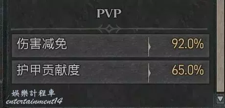 而第二行的護甲貢獻度是指剛才說的 護甲、減免、抗性等共同作用後產生的結果 而PVP中護甲參與進來的程度更高參與程度達到65%(PVE中是50%)