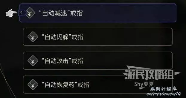初始會默認給予玩家4個輔助配件,分別為:自動減速、自動閃避、自動攻擊、自動恢復藥。