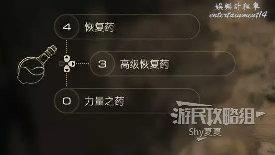 可以進入【主功能表-道具】介面使用道具,也可以將道具登錄到【道具快速指令】欄中,最多可以裝備3個快速使用的道具,建議放小血瓶、大血瓶以及一個功能性道具。