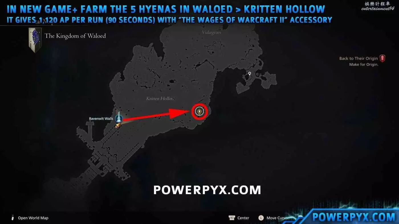 在新遊戲+推主線到大後期的結局前,前往沃魯德的最後一個區域,刷一群鬣狗,每次可以獲得1120AP,步驟如下: