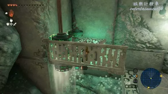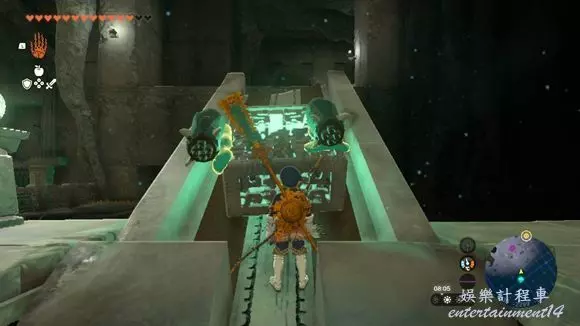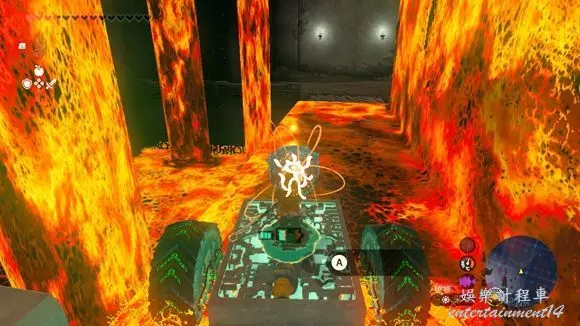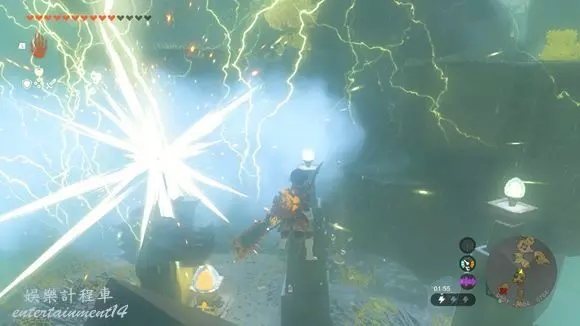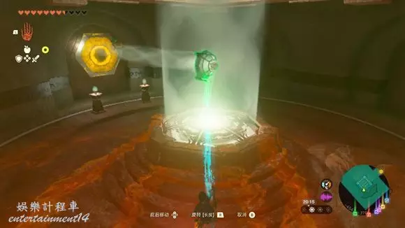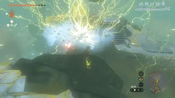 在一個有黃燈的機關,站在推動的石塊上,等待雷電擊中即可飛到對面。