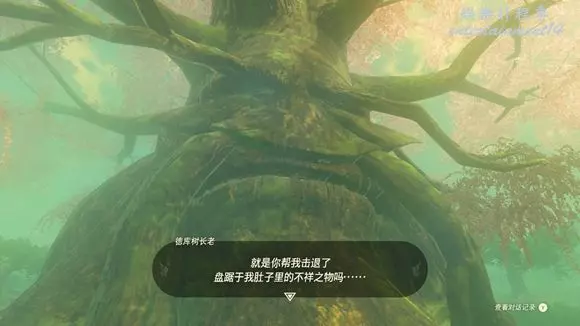 長老就是巨大的樹根了,爬上去,站在有一個樹枝的圓樁上對話就可以了。