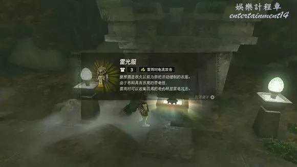 然後上去打開寶箱,獲得雷光服,穿上雷光服跟塔烏洛對話,塔烏洛說這服裝跟牆壁的碑文一樣,應該還會有其他的服裝,然後說洛貝利創造了一種方便尋找物品的裝置,接下來就前往哈特諾村的研究所看看吧。