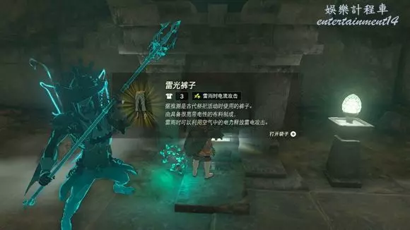 不過這裡就不去了,因為其他兩個部件的套裝就在附近,我們直接出門左轉,一直沿著河邊貼牆壁左走,河流會出現2只怪物,右邊有一個發光的房間,座標為(0965 -2698 0007),進去就能拿到雷光褲子了。