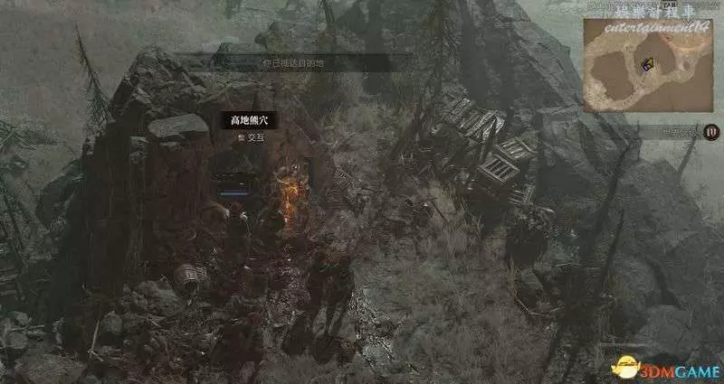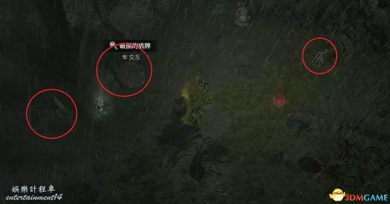 來到目的地區域後和紅圈內的盾牌、石堆、籃子互動。