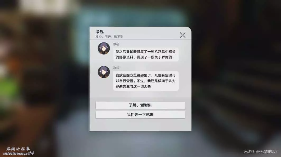 1.當我們在完成了羅刹的同行任務以後,我們會在短信框收到一份來自淨硯的短信,短信中要求我們再次回到地衡司觀看錄影