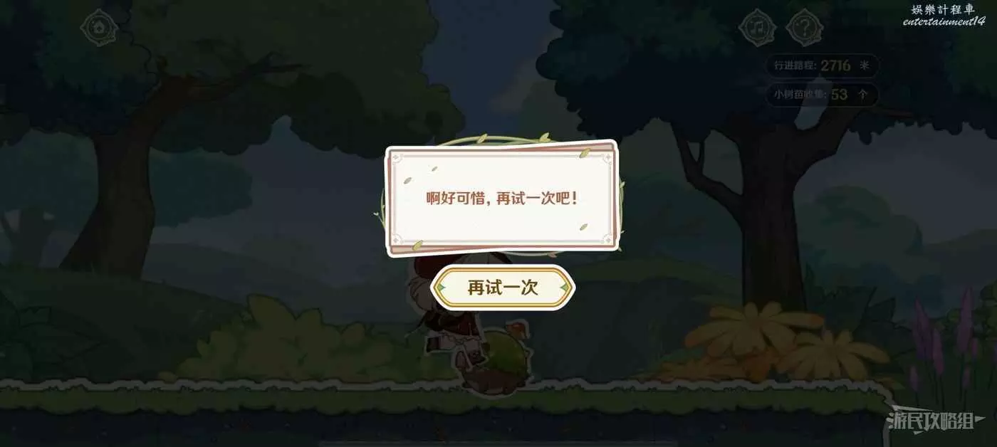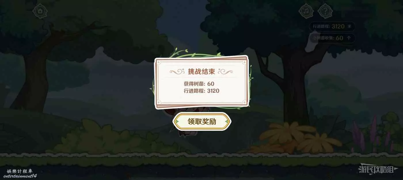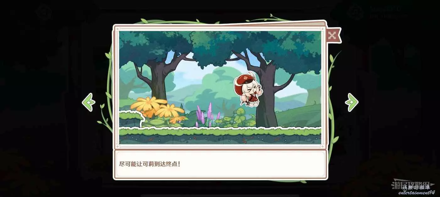 橫版跑酷遊戲,點擊螢幕可以跳躍,使用跳躍躲避前進道路的坑和障礙物,並收集樹苗,讓可莉到達終點即可獲得原石獎勵。