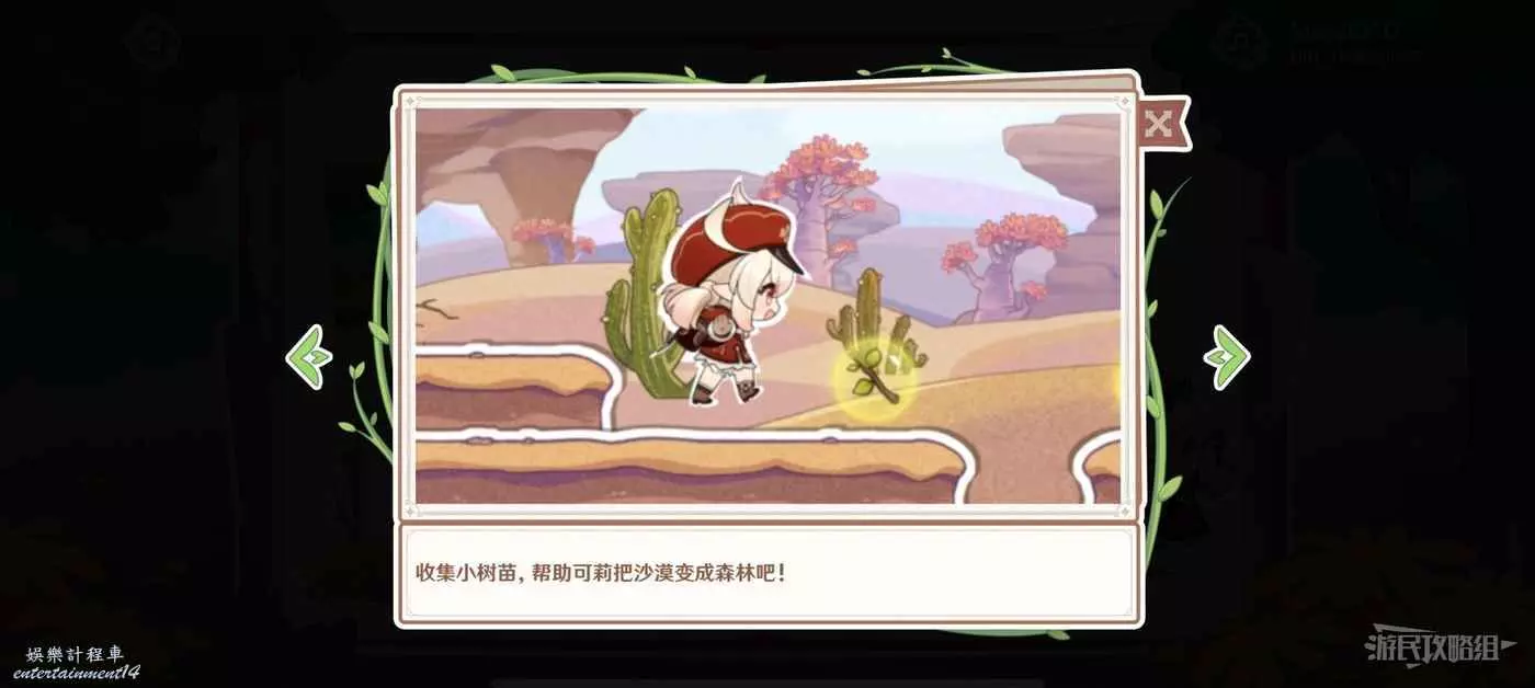 - 玩法介紹:活動期間,旅行者需要幫助可莉收集小樹苗,把沙漠變成綠洲。在行進過程中需要躲避障礙物,讓可莉順利的前進。達到終點後會結算獲得小樹苗數量,盡可能獲得更多的小樹苗