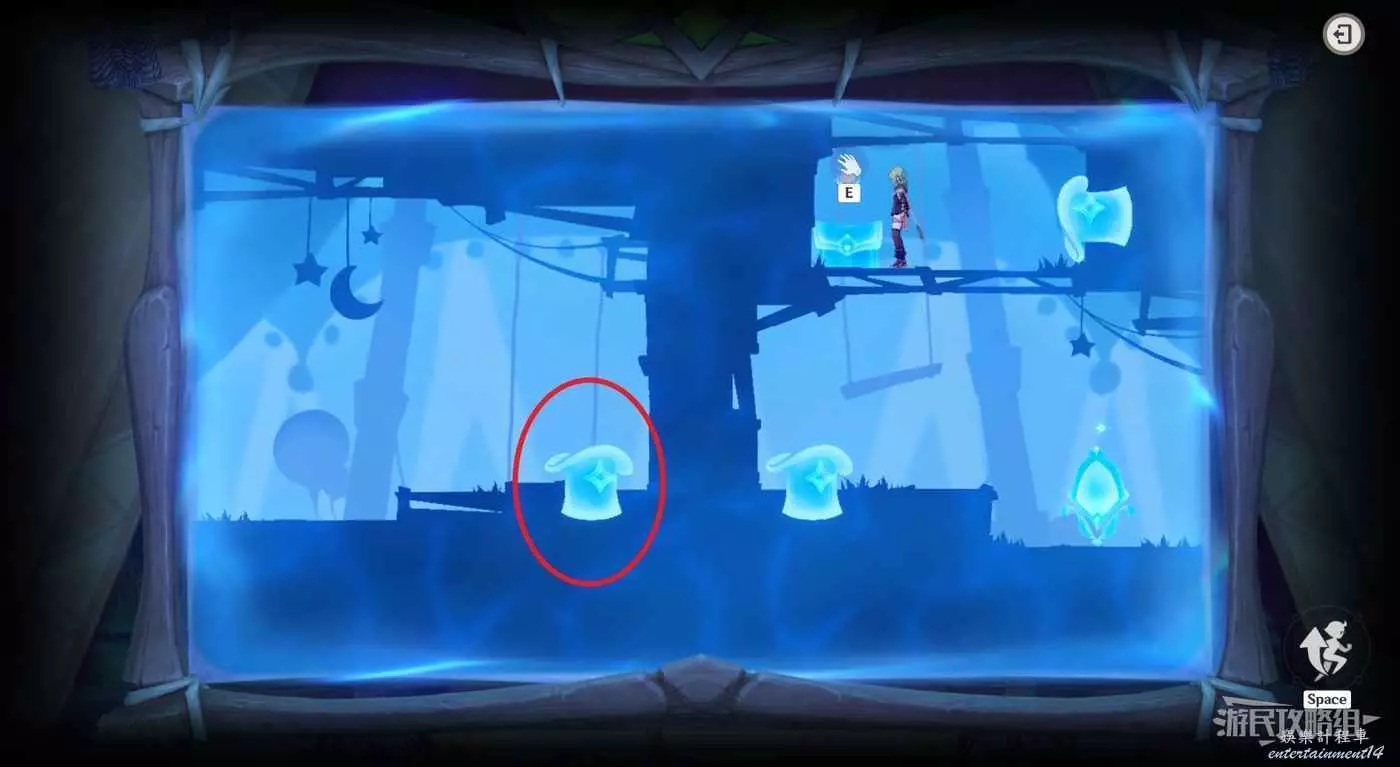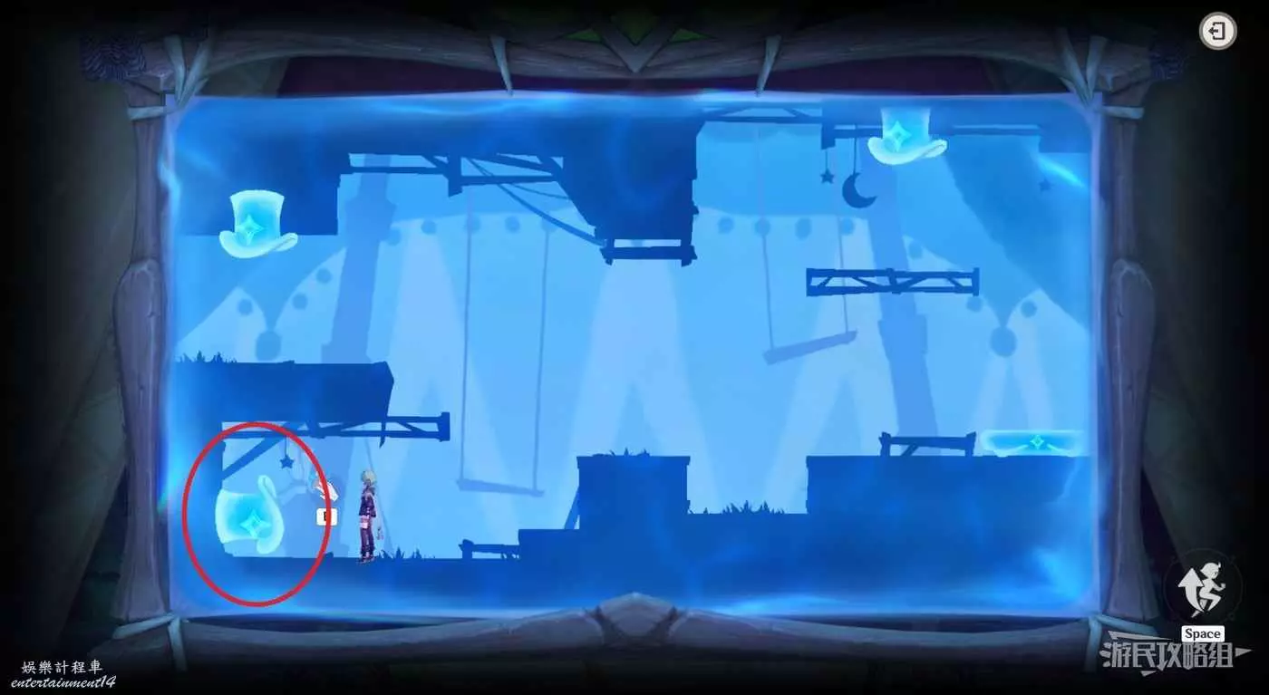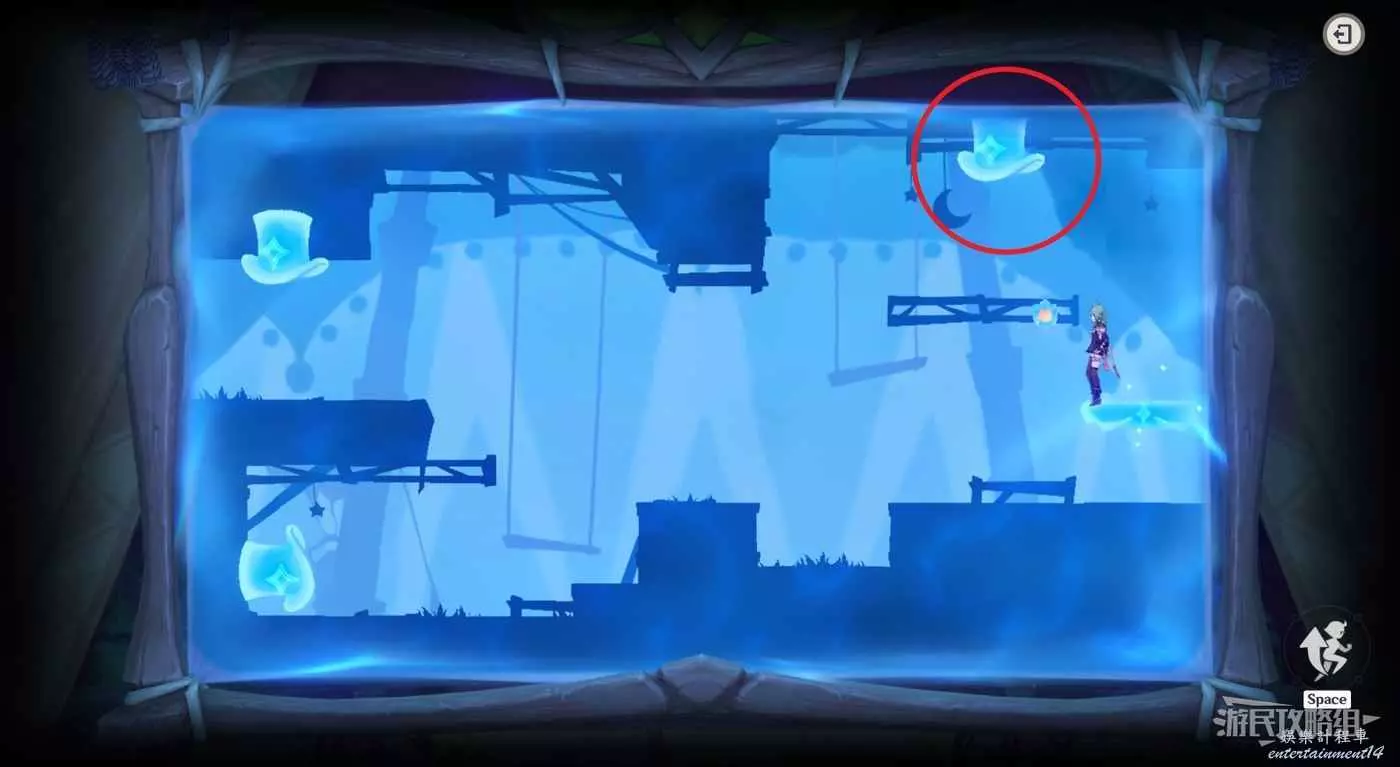 開啟寶箱後返回新地圖,點擊右側地面上兩個箱子解鎖新板塊,乘坐右側檯子到達上層,進入頭頂的帽子。