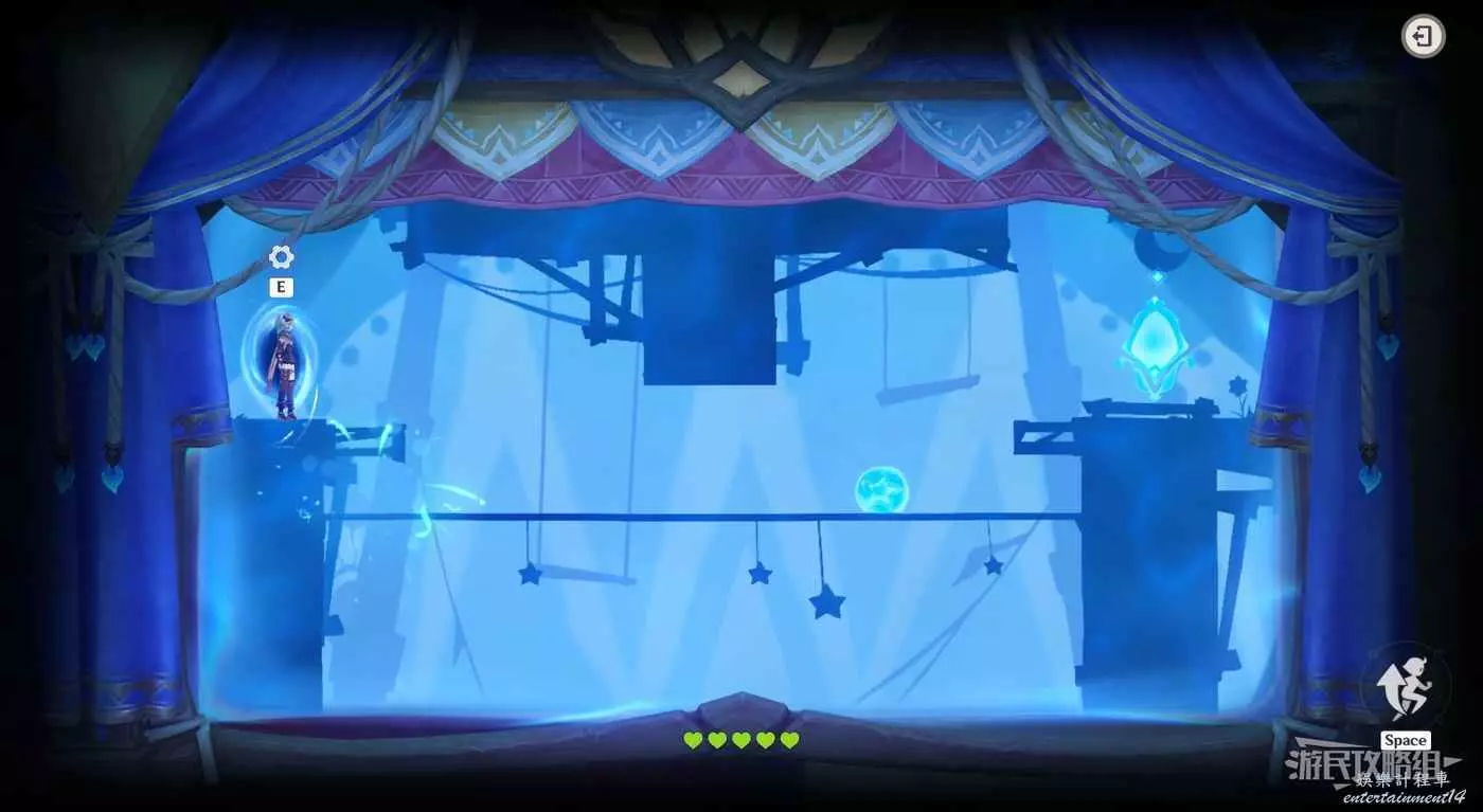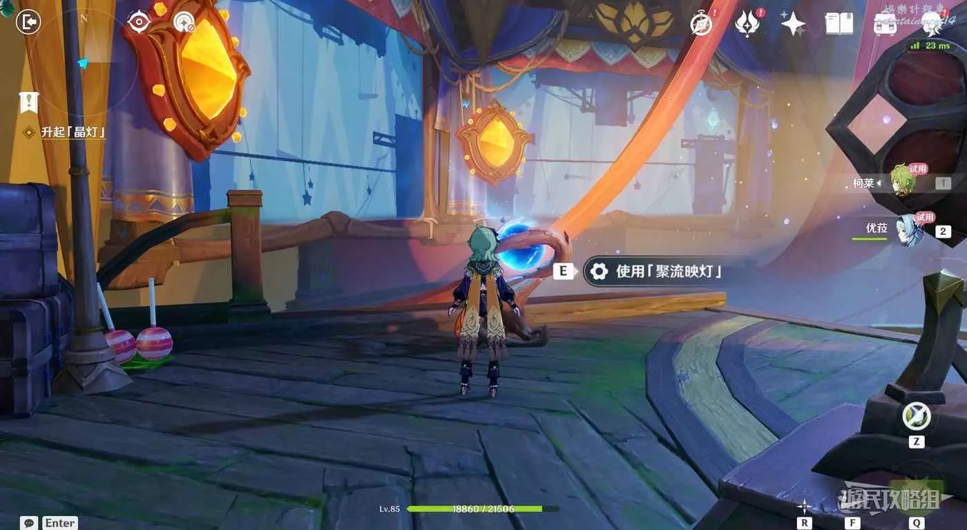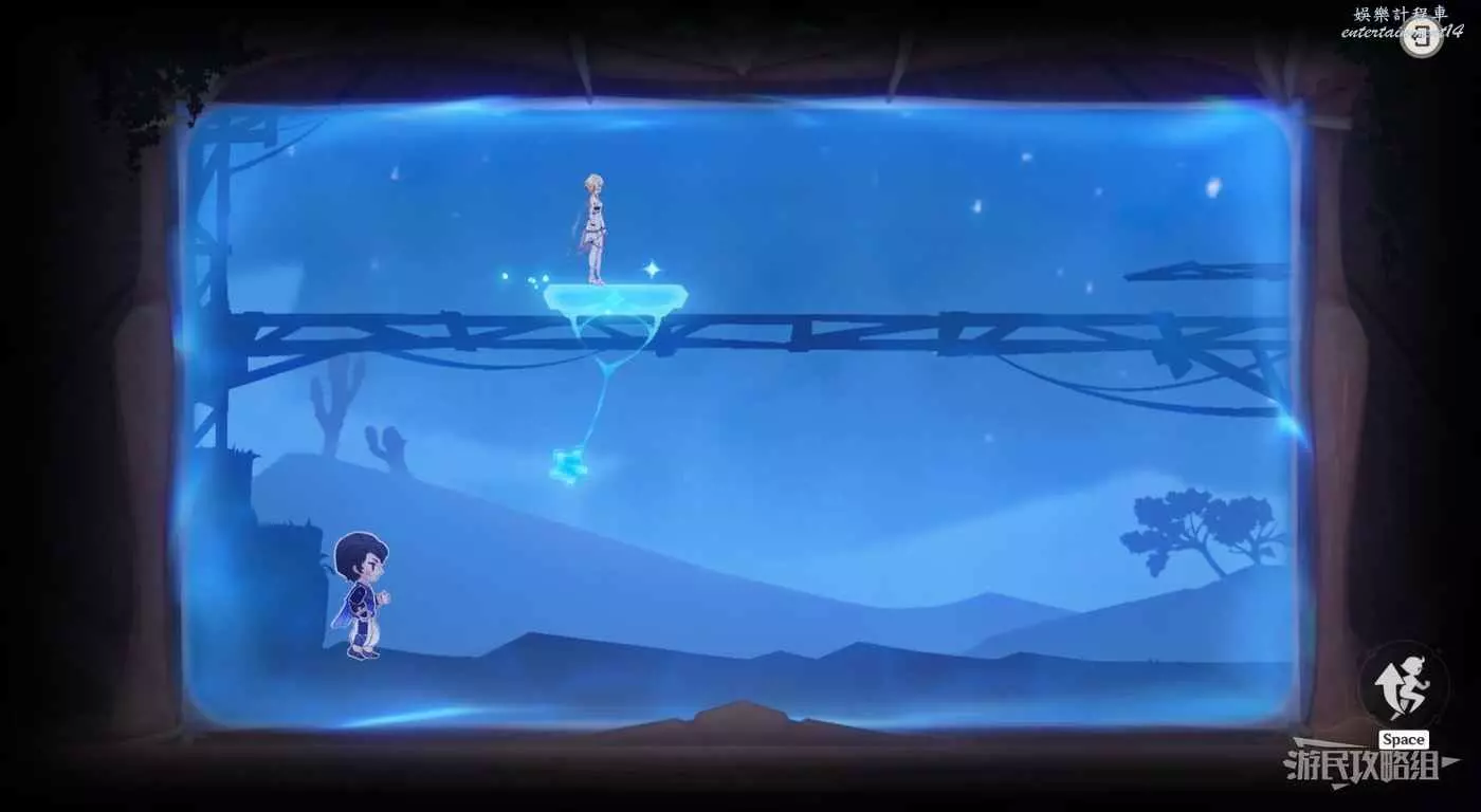 劇情結束後,與聚流映燈互動進入先成圖。跟隨演出進程開始操作。首先在聽到提示時踩住前方掛著流行的檯子。等待凱亞念完臺詞,與介面右側的傳送門互動傳送到下一場景。