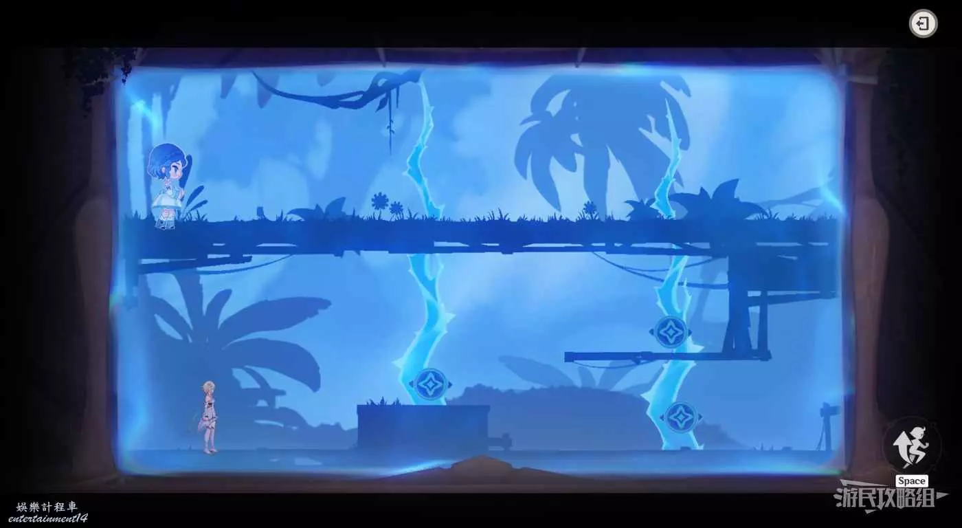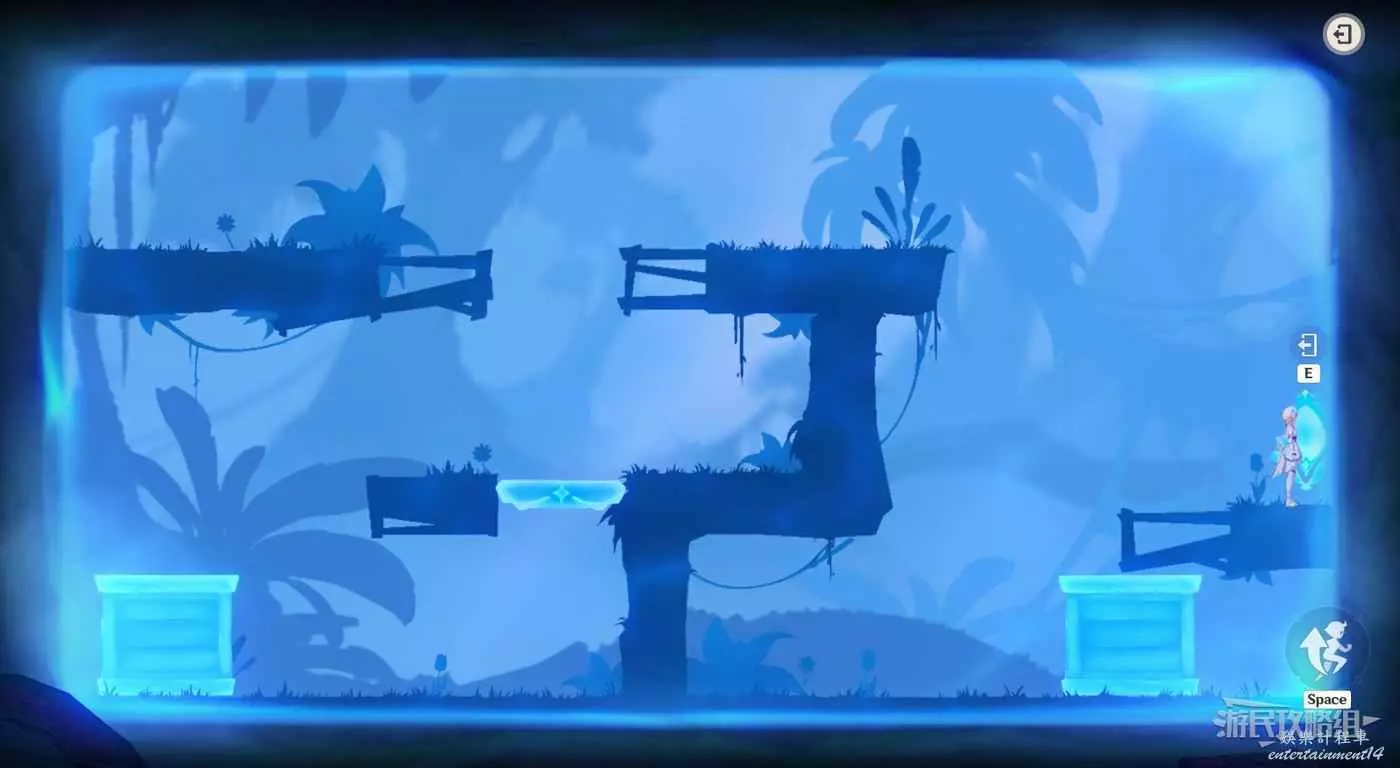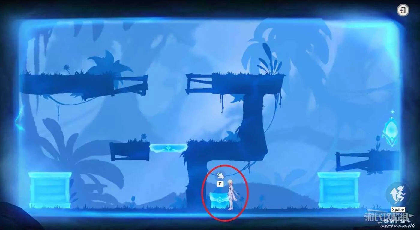 劇情結束後,與聚流映燈互動進入先成圖。跟隨演出進程開始操作。首先在聽到提示時踩住前方掛著流行的檯子。等待凱亞念完臺詞,與介面右側的傳送門互動傳送到下一場景。
