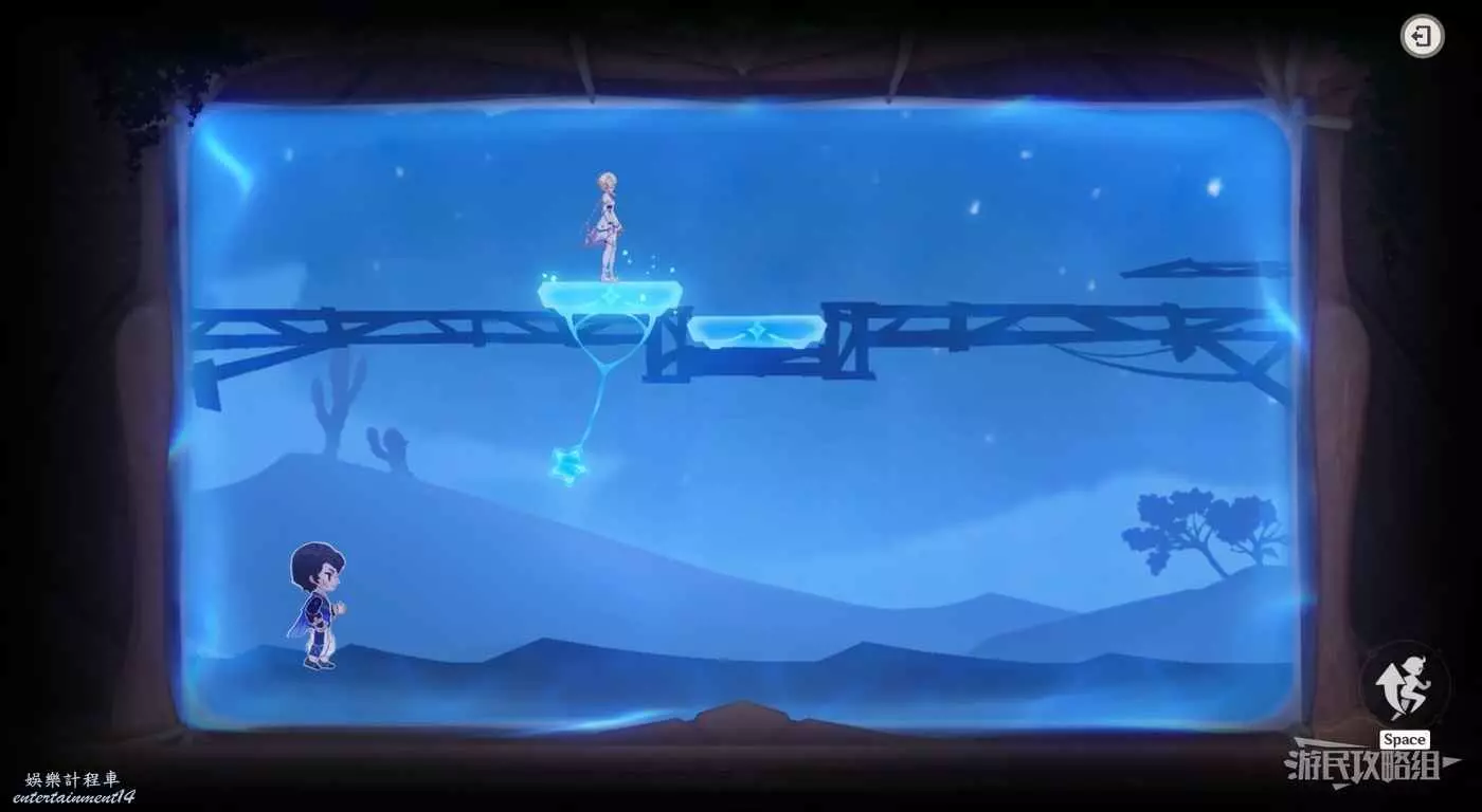 當凱亞念到臺詞【星星不斷前行】時,踩住掛著星星的檯子移動到前方,然後踩另一塊檯子讓另一塊檯子下降,然後繼續返回踩掛著星星的檯子讓星星前進。最後與螢幕右側的傳送門互動前往下一場景。