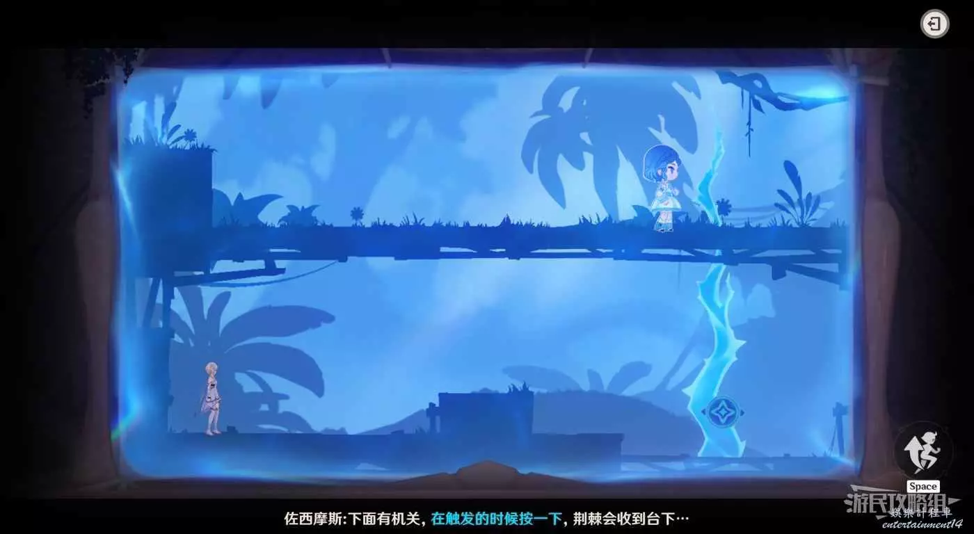 下一個場景沒有互動,繼續前往下一個場景,在聽到臺詞提示時,與荊棘互動讓荊棘收回台下。然後進入傳送門到達下一個場景。