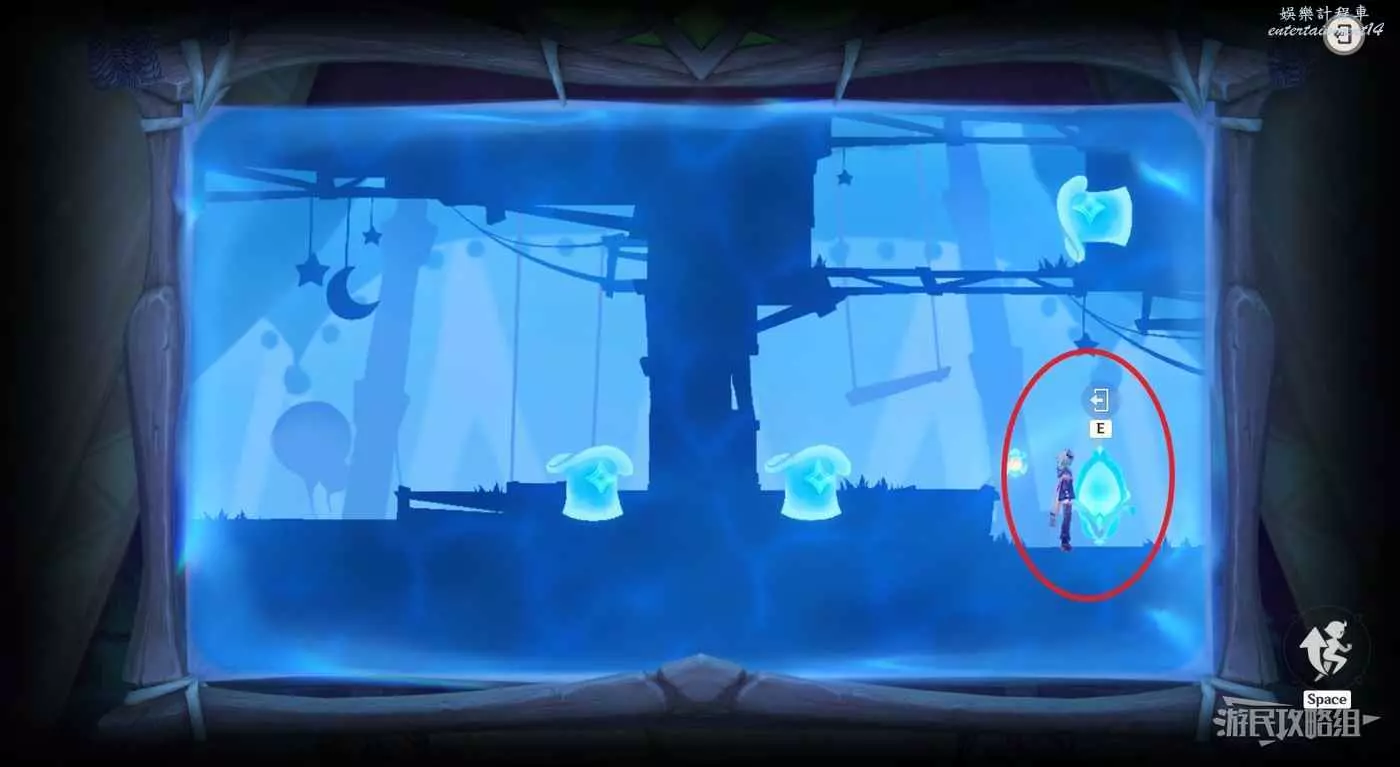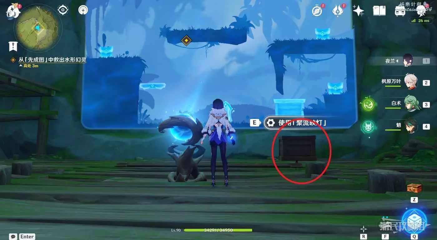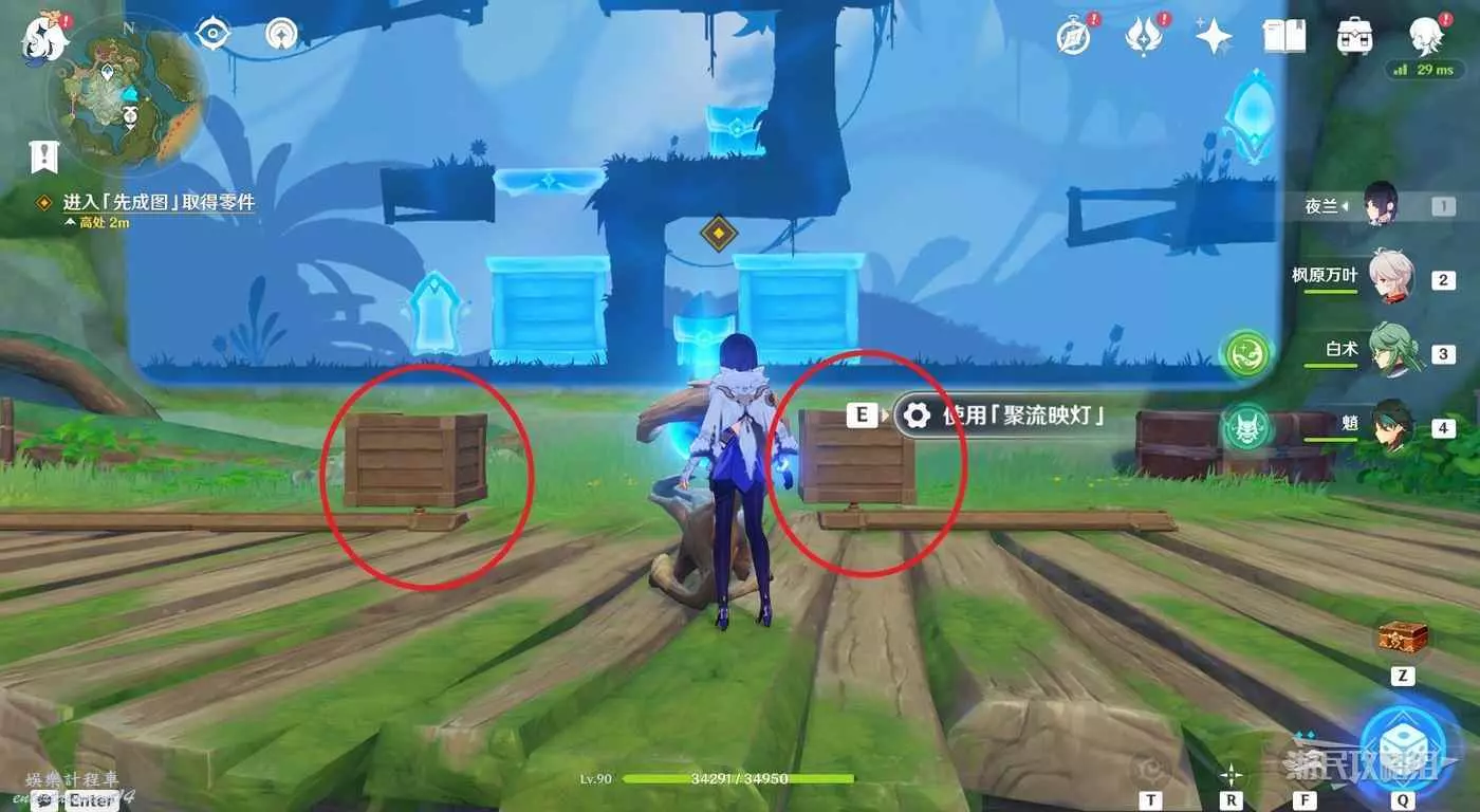 劇情結束後,先分別與聚流映燈推開旁邊的兩個木箱子,再與聚流映燈互動進入先成圖。