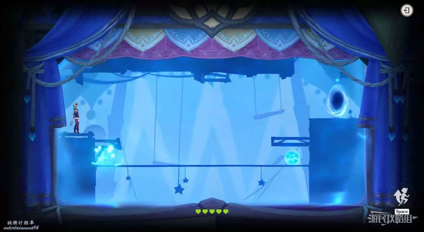 一邊跳躍躲避藍色水球一邊到達對岸的傳送門。