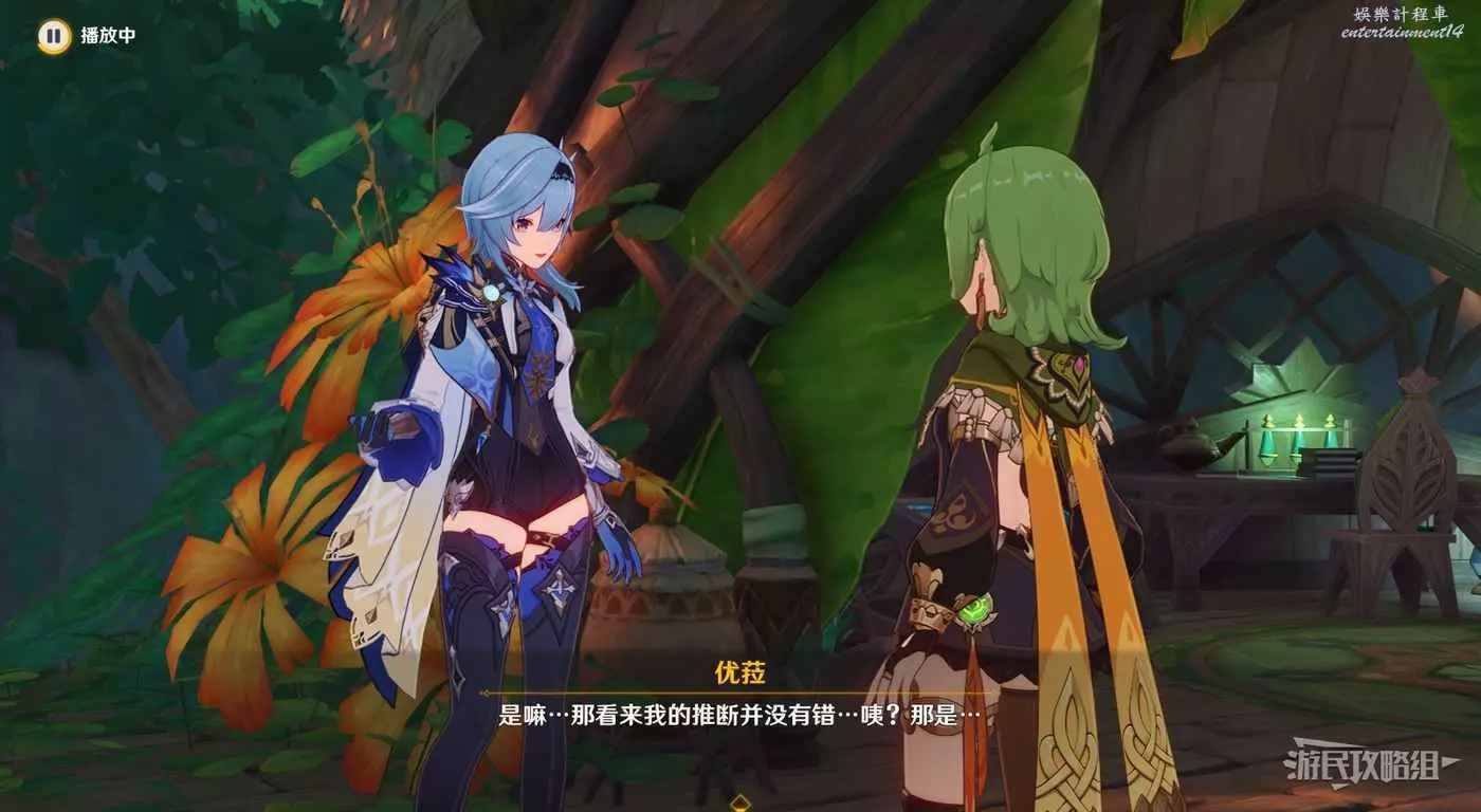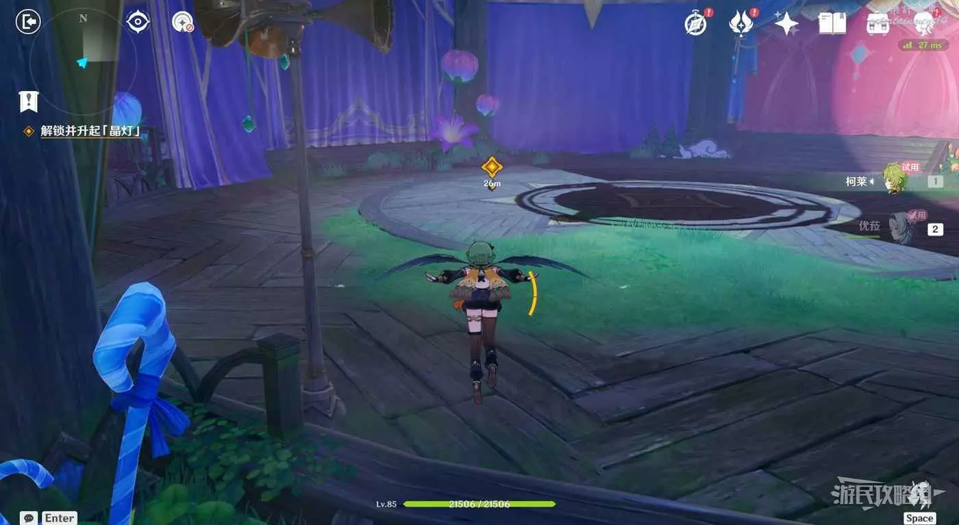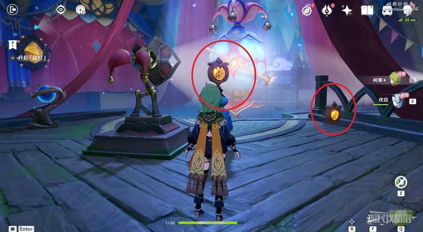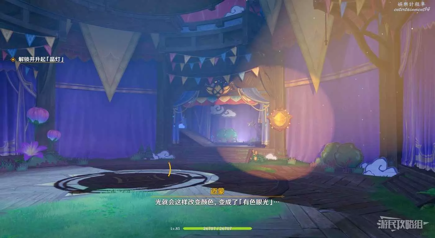 到達目標位置後,自動觸發對話。對話結束後,面對中間的晶燈球,先到左側檯子上拾取兩個光斕彩鏡,分別裝入兩個彩燈中。