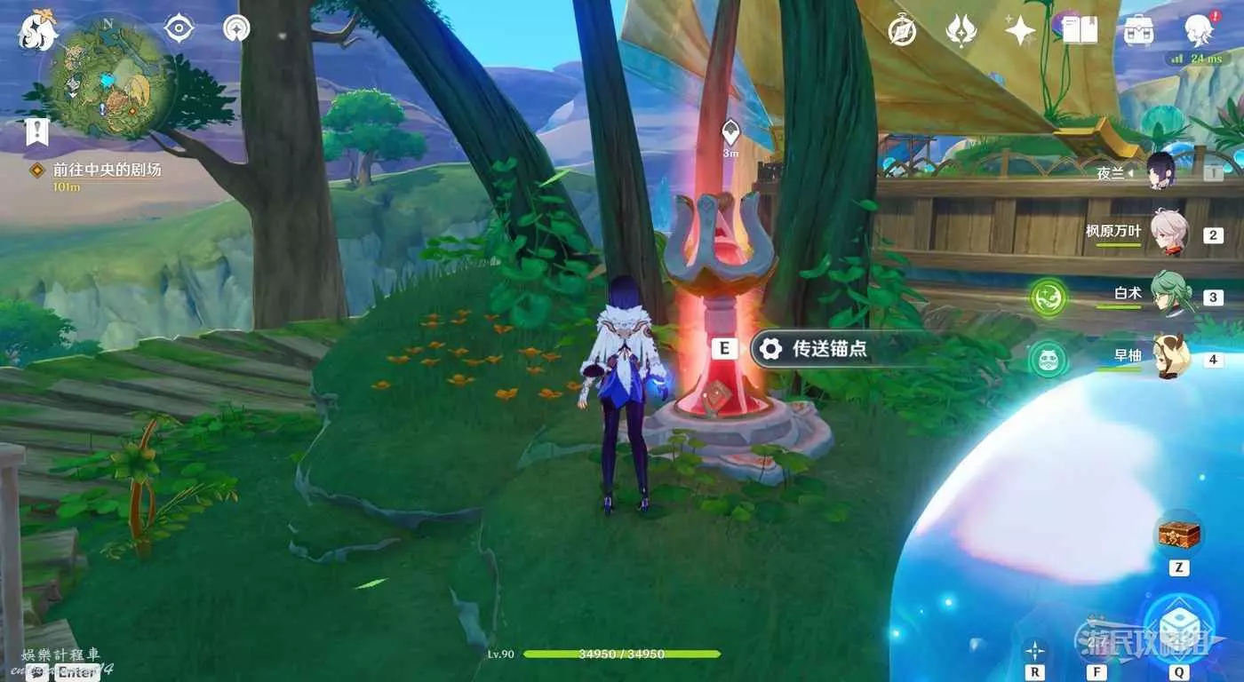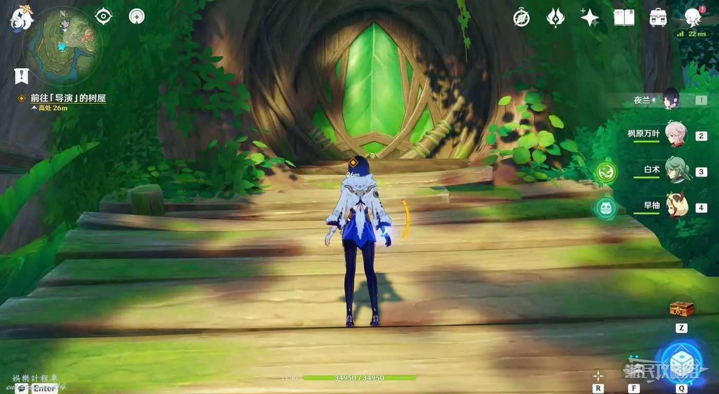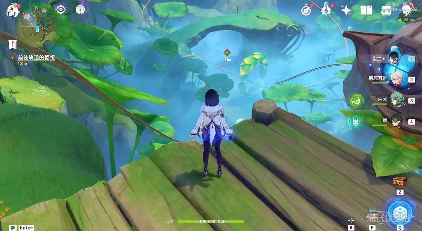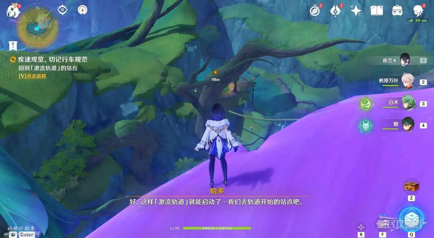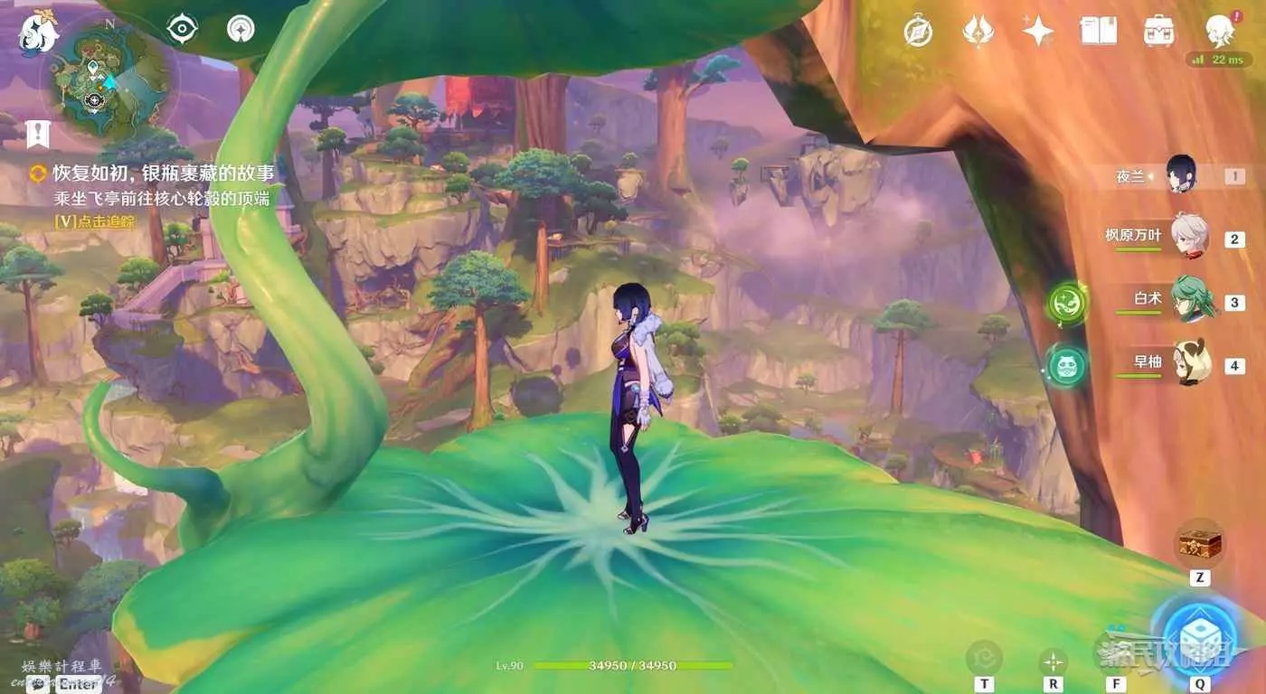 一路跟隨任務指引前進,需要走很長的路,路上有四葉印可以使用。順便開啟路上的傳送錨點。