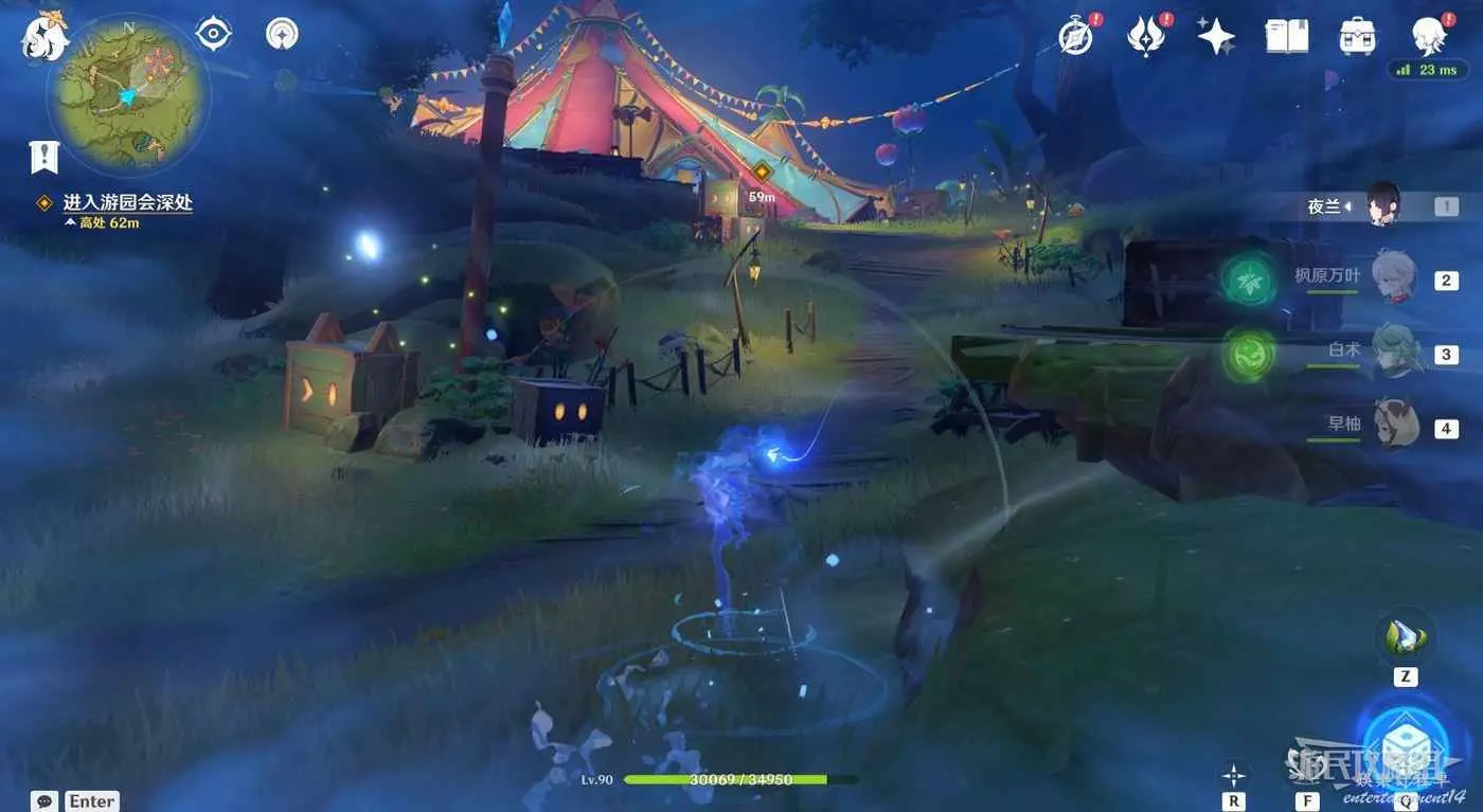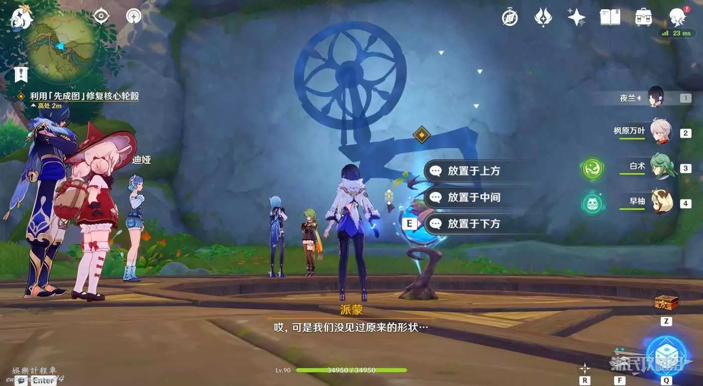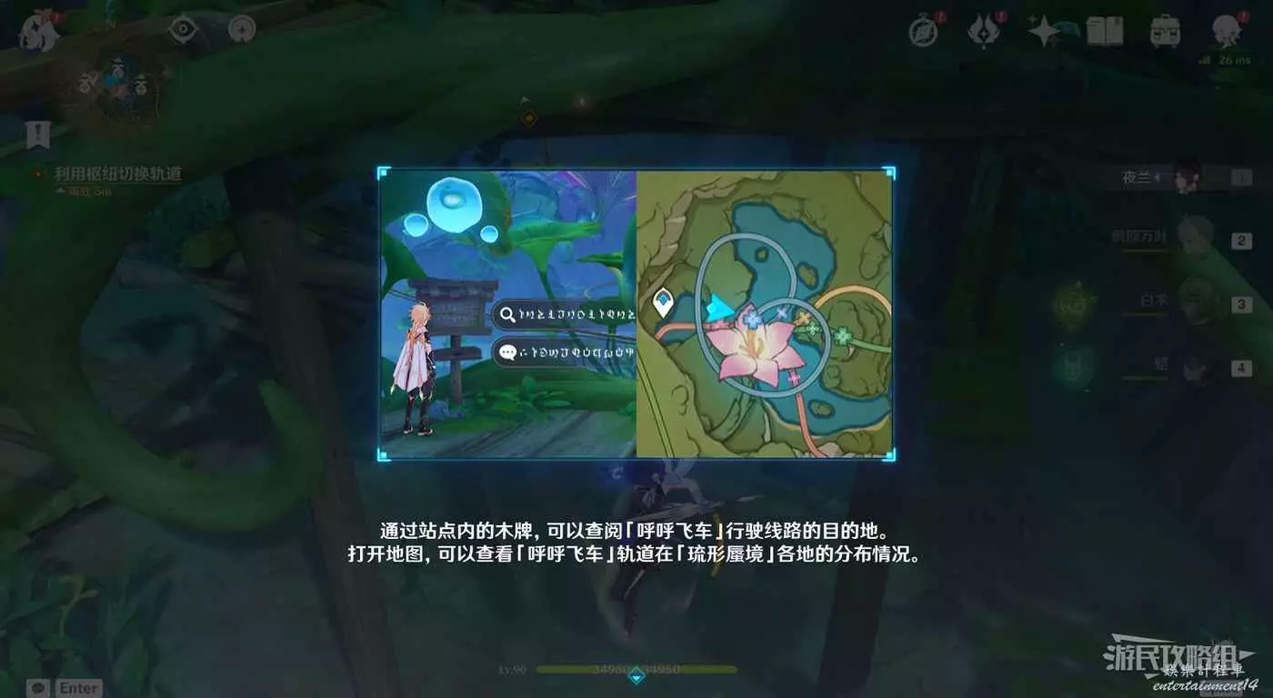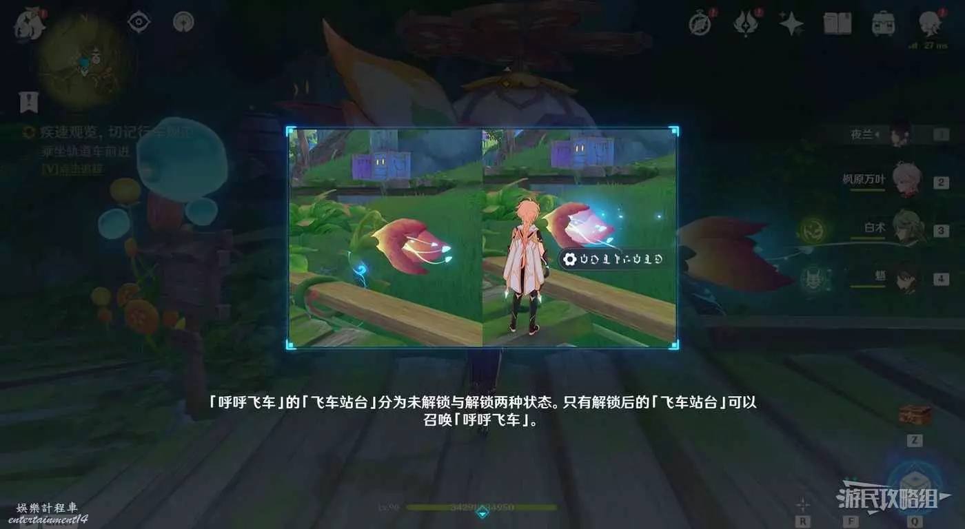 看完教學後,乘坐纜車。到達軌道中斷位置後,自動觸發對話,對話結束後,先把聚流映燈旁邊的木箱推開,然後與聚流映燈互動進入先成圖。