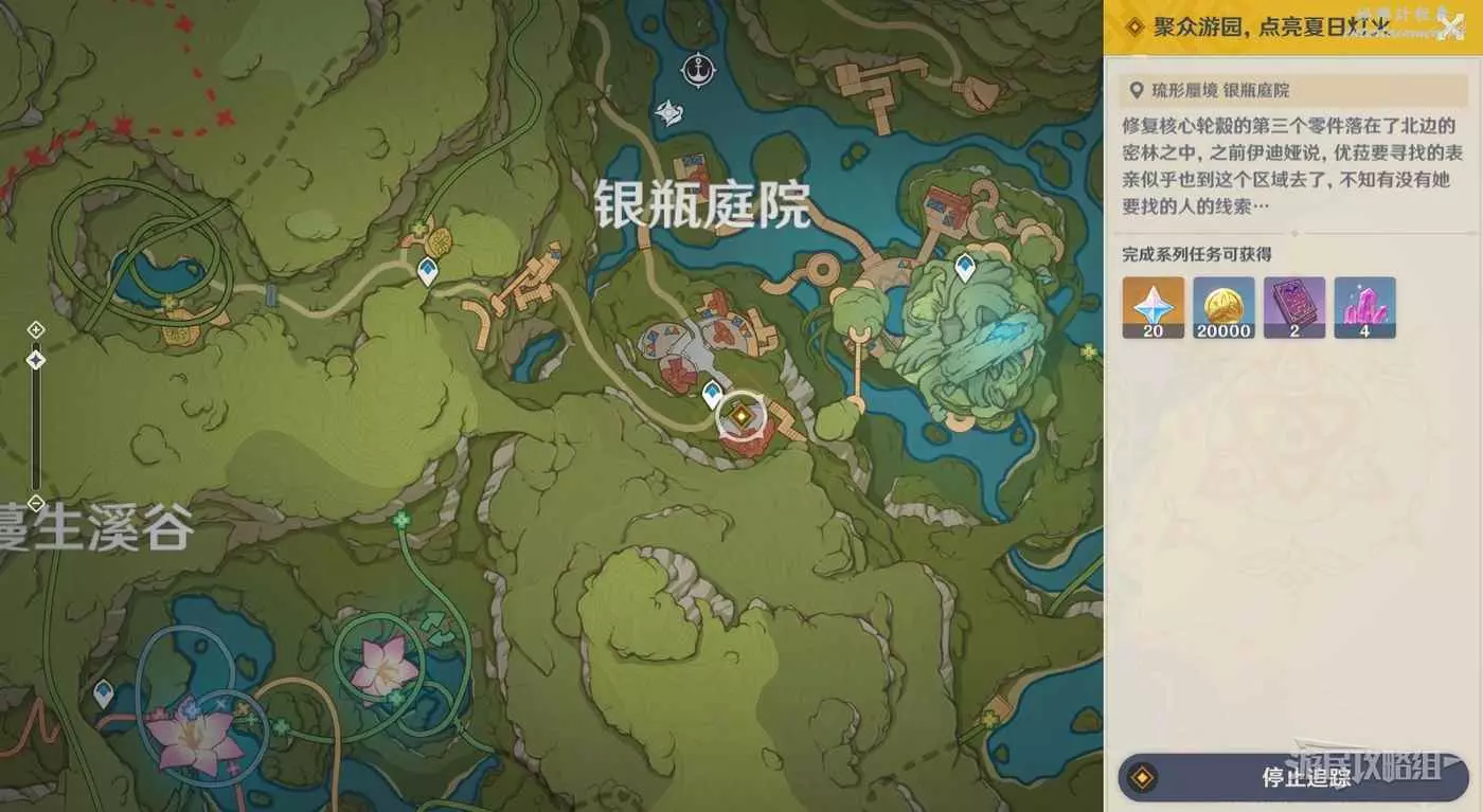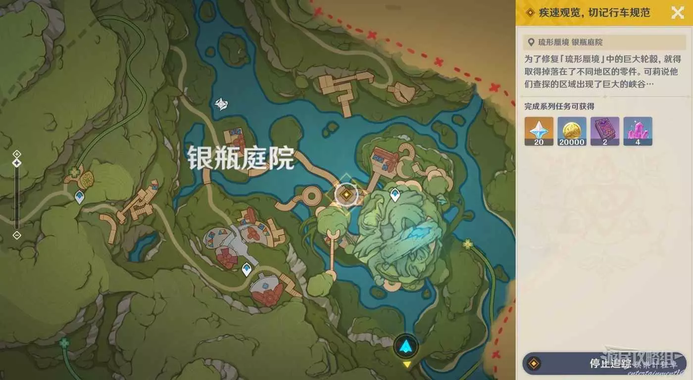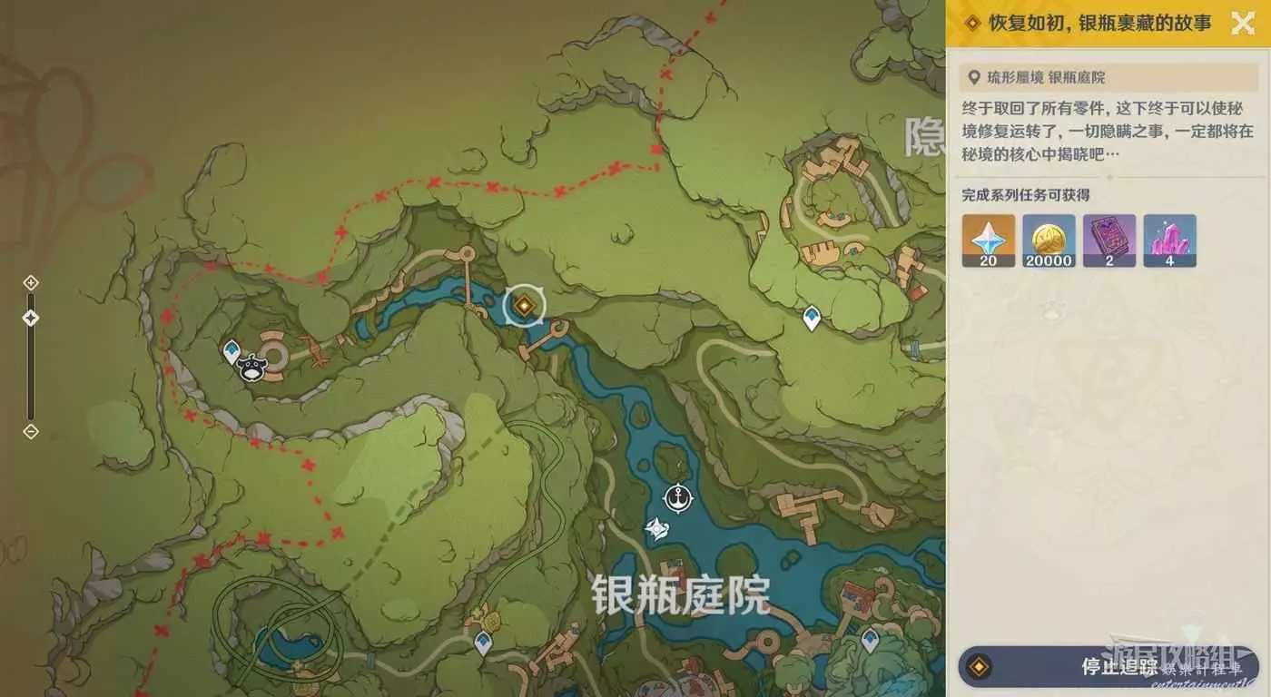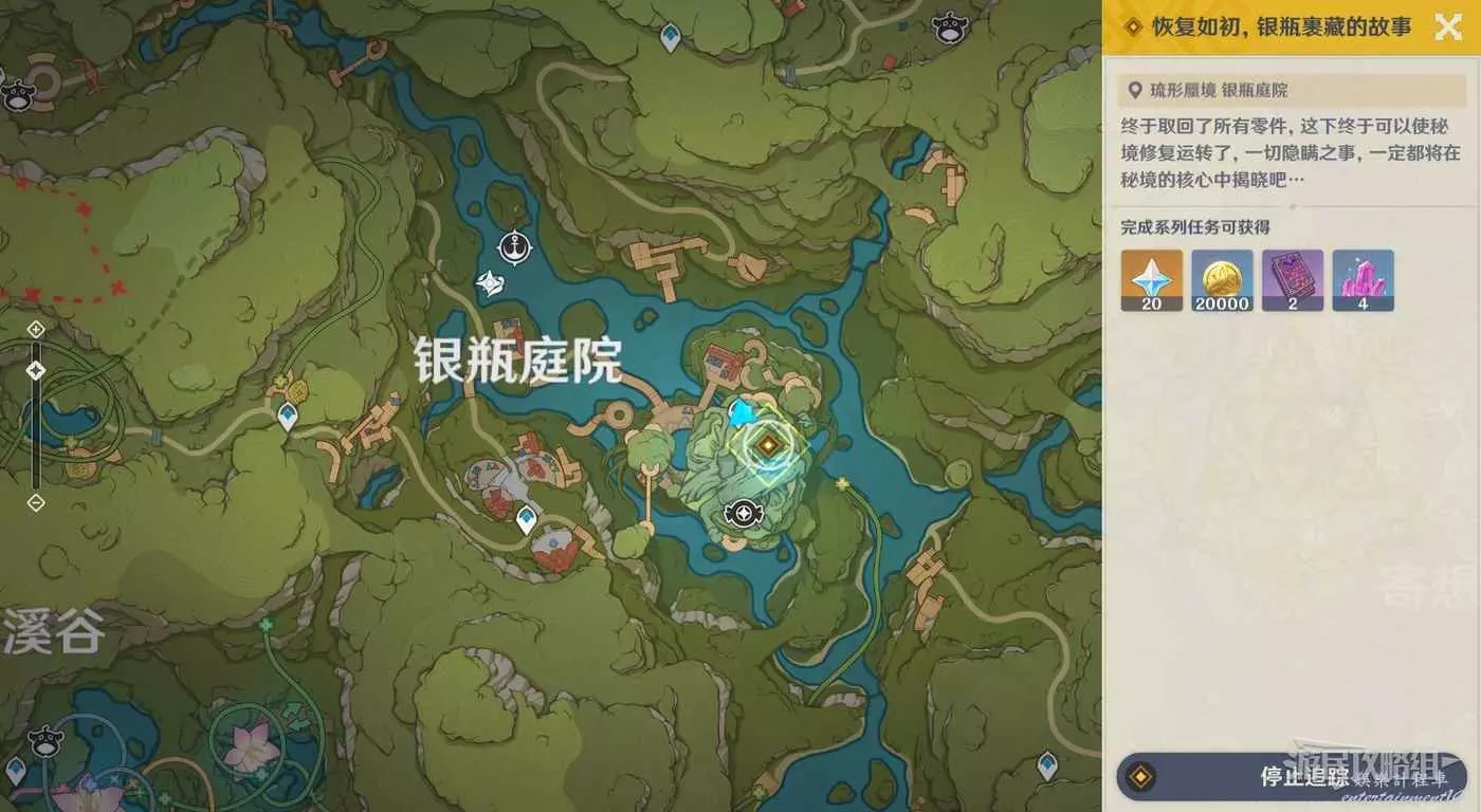 離開先成圖後會自動觸發對話,對話完畢需要返回銀瓶庭院,可以使用之前啟動的傳送錨點直接傳送。返回銀瓶庭院後自動觸發對話,對話結束任務完成。