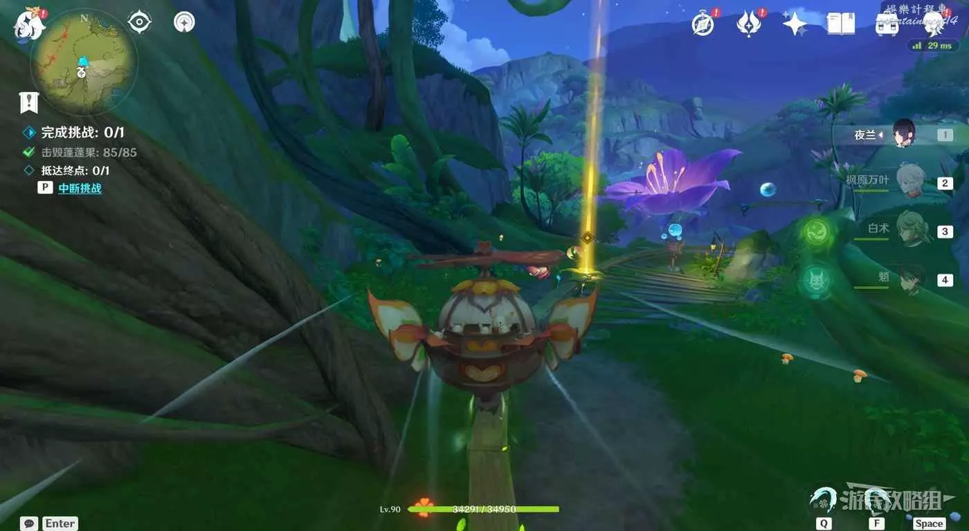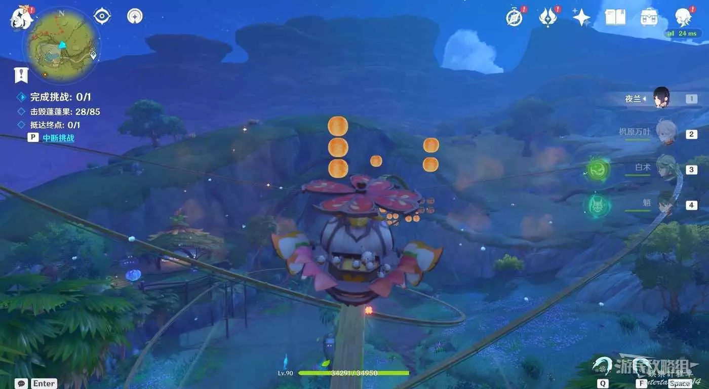 注意這裡乘坐纜車的途中也會觸發擊碎目標數量蓬蓬果的挑戰,達成目標後可以開啟珍貴的寶箱。