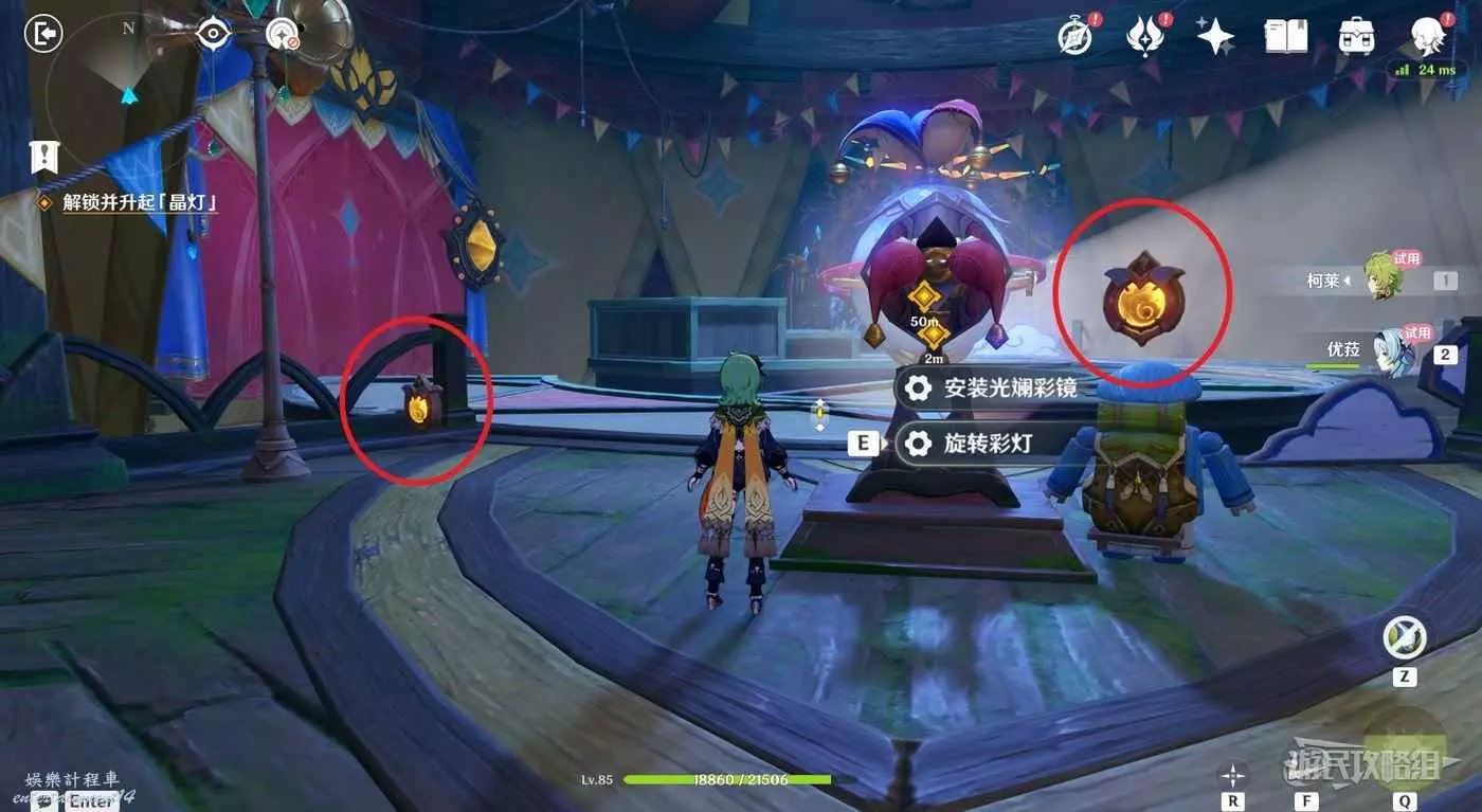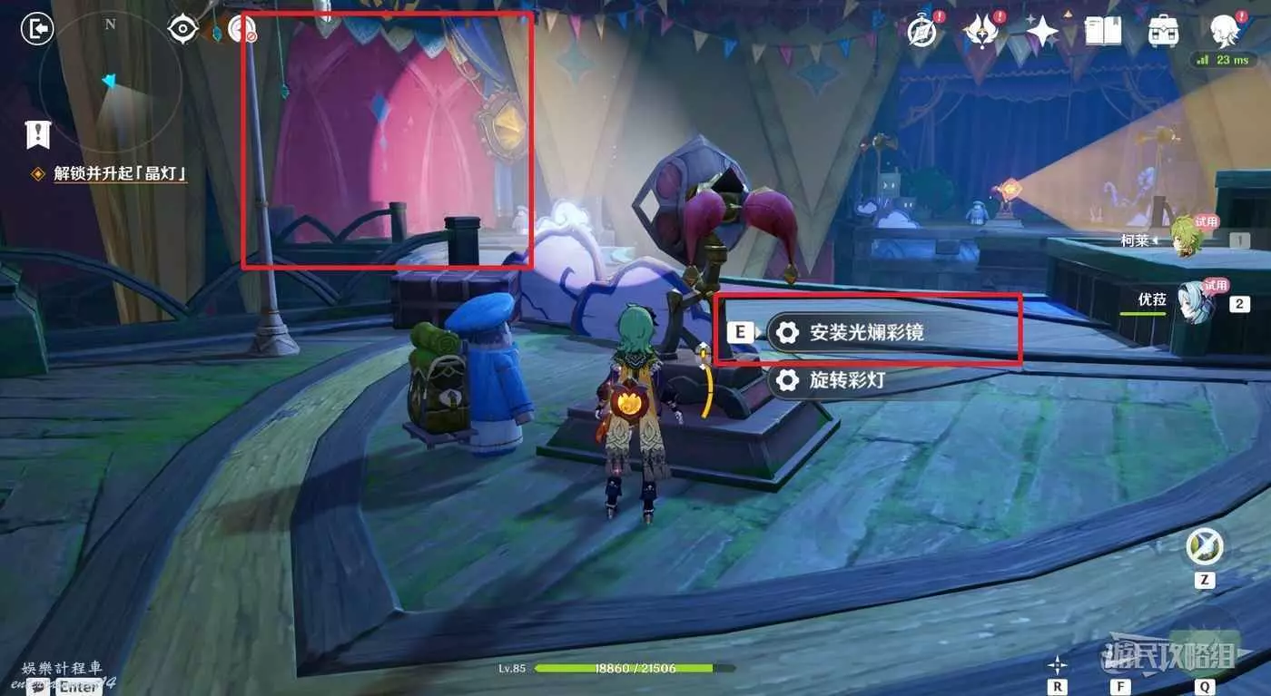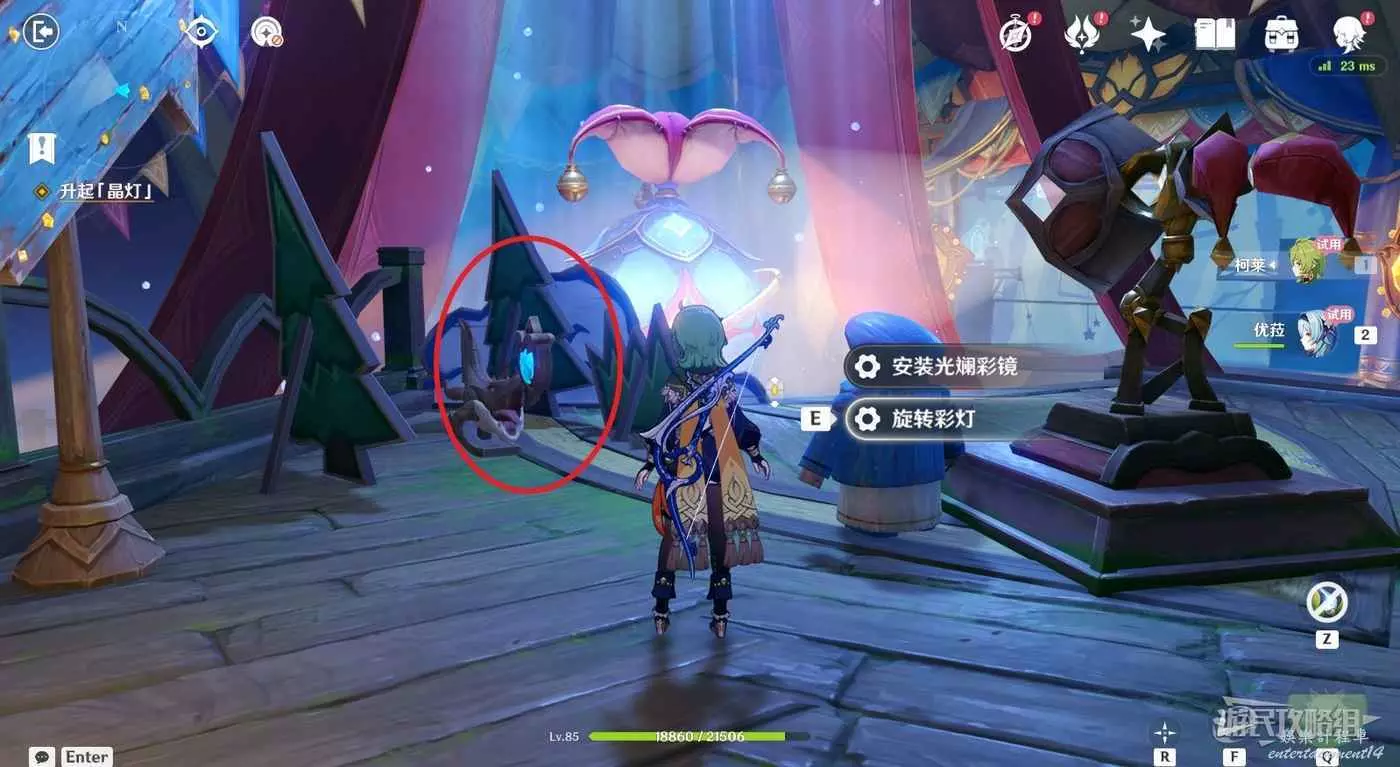 然後前往這盞彩燈的正對面,分別拾取地上的2面光斕彩鏡,為彩燈安裝後選擇旋轉彩燈。