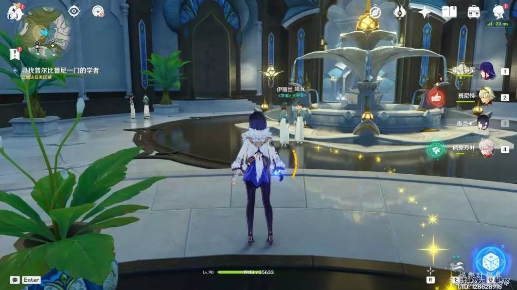4.我們跟著任務的指引,進入教令院的大門,隨後我們會看到噴泉邊上的兩位學者,NPC伊麗絲以及哈瓦