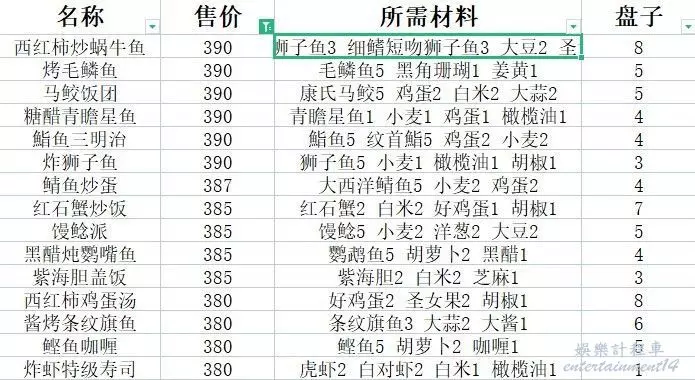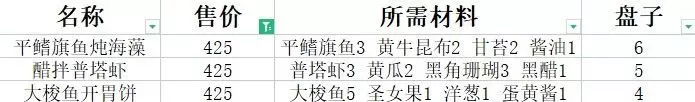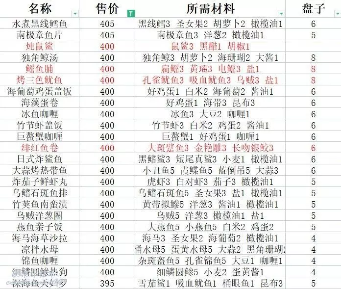 裡面比較出彩的有三道333和燉鼠鯊,其中緋紅魚卷只需要養魚,鰩魚脯和烤三魷魚雖然多要一個鹽但一級就能足足出八盤,看你是否想省事了。燉鼠鯊只要鼠鯊+兩瓶調料,而且屬於鯊魚料理在鯊魚派對能賣高價,建議搞一搞。