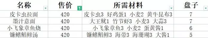 皮卡蟲拉麵和鐮鰭鯧鯵湯要海菜,墨汁意面一份要消耗高達6個蔬菜,不過一級就能出七份。