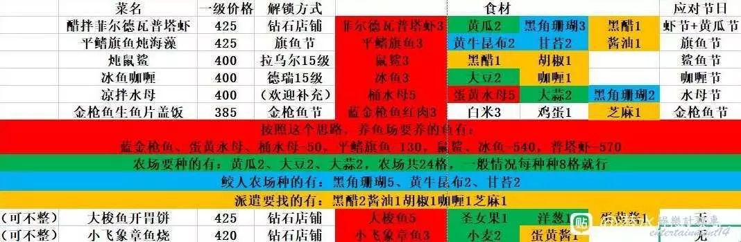 我的思路是:黃瓜串隕落後,料理應當應付日常+節日兩種情況,所以我找出所有節日對應的最貴的料理(因為未考慮成本所以不一定是最賺錢的料理,歡迎討論補充),而正好其中包括了425檔位的日常最貴料理。所以我認為把應對七大美食節的六種料理全部升滿,日常也可以賣其中有富餘的,這樣就可以應對所有情況。詳情如圖。