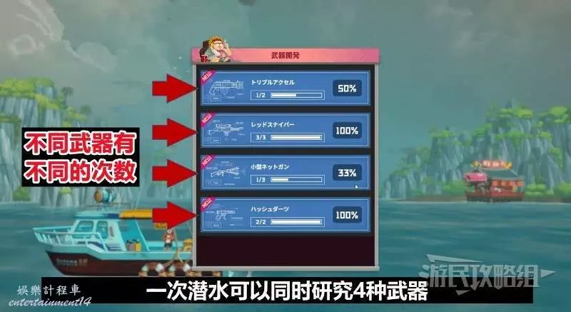 製作武器需要先研究。潛水過程中有幾率遇到一些武器箱,開啟武器箱獲得新武器並攢滿發現計量表(每持有1次就能積攢一定比例的計量表)後,即可從武器商店中研究。