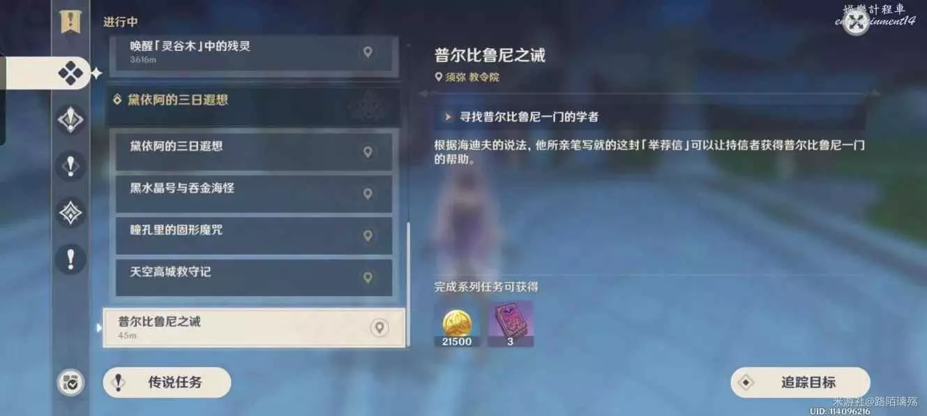 原神 (Genshin Impact) 普爾比魯尼之誡任務攻略 9 7 月 2023-07-09 廣告 作者:路陌璃殤 來源:米遊社論壇 位置:靠近教令院自動接取 1、尋找普爾比魯尼一門的學者 2、尋找賽達菲 3、幫賽達菲找回箱子 4、擊敗出現的盜寶團 5、將箱子交還給賽達菲 6、去找海迪夫 7、與其對話 這個任務算是層岩巨淵幫助海迪夫後的一個後續吧。
