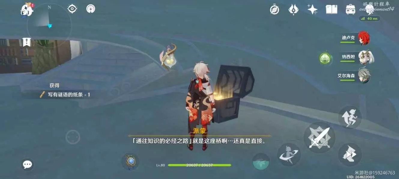 在通往智慧宮的走廊下找到精緻的寶箱,打開得到第四個謎題「池上之花,盛水為珠。」