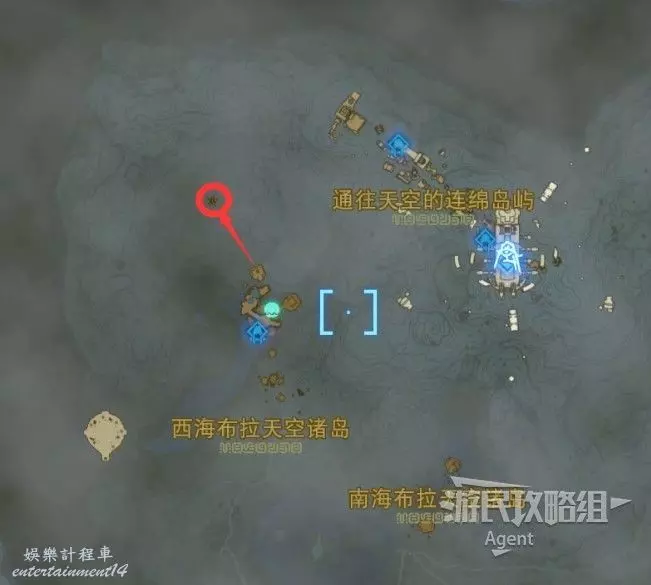 連續利用風柱往上飛,來到島的頂部。(下圖還標有島上四個呀哈哈的位置)