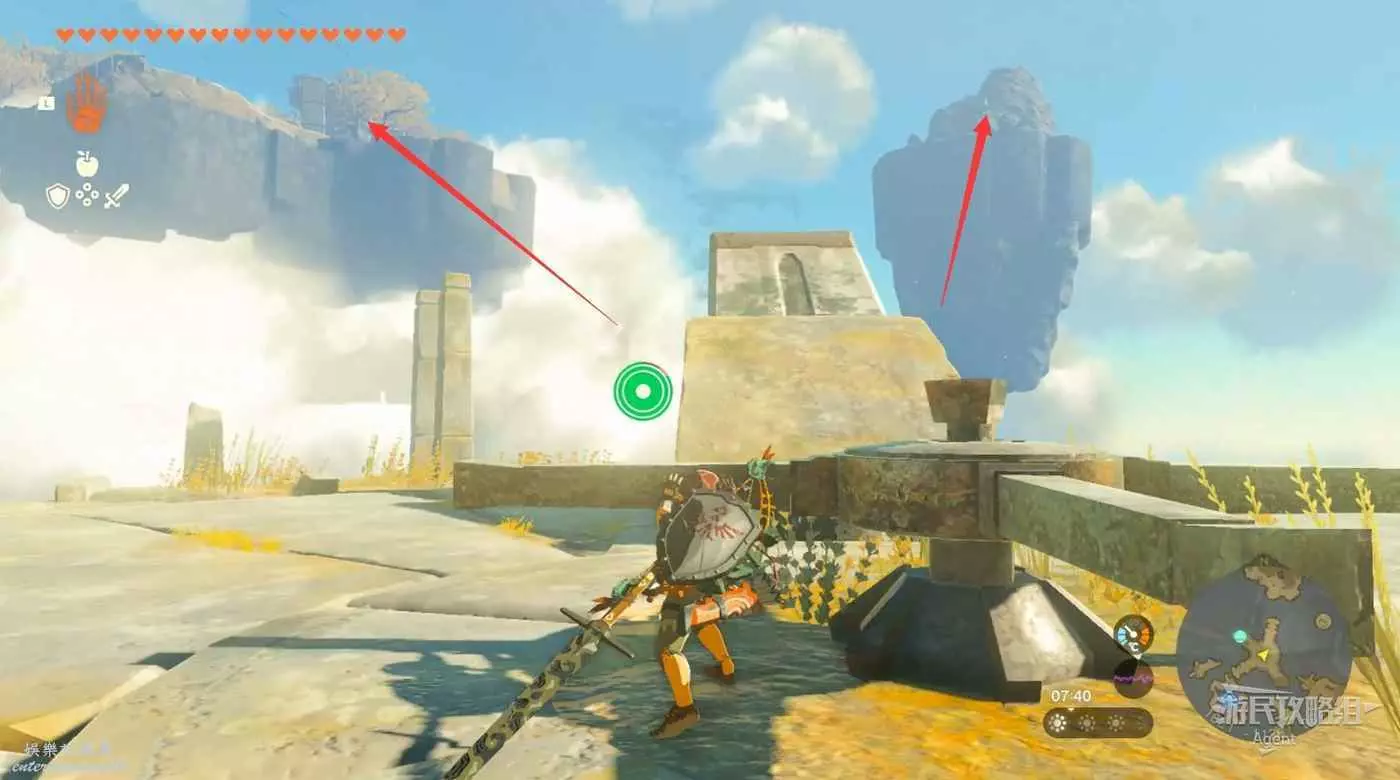 更北面還有中央海拉魯天空諸島附屬的兩個小島,從下方用時光倒流隕石上去,上面各有個寶箱。