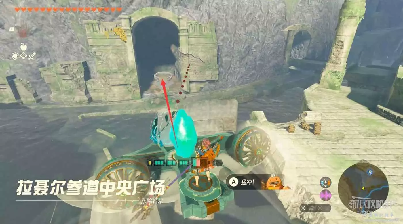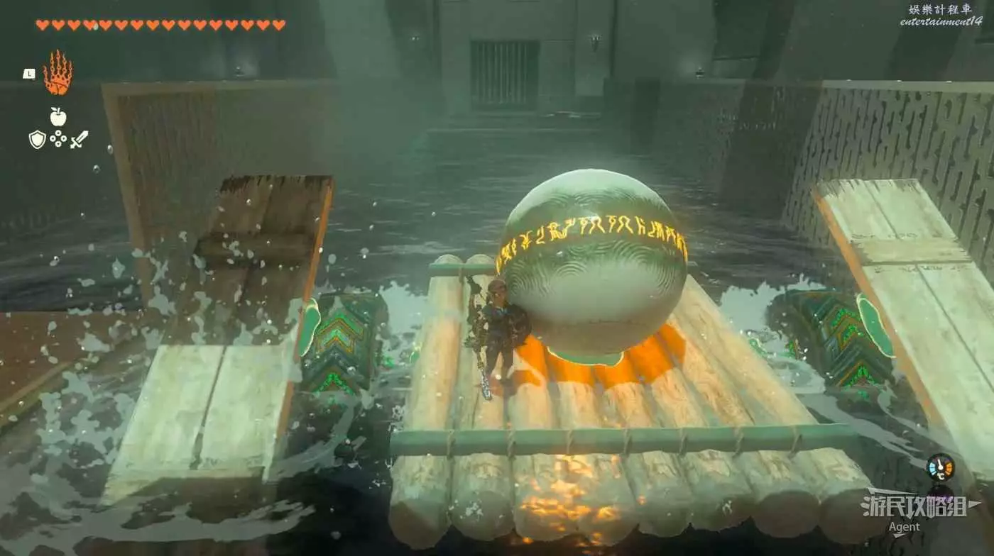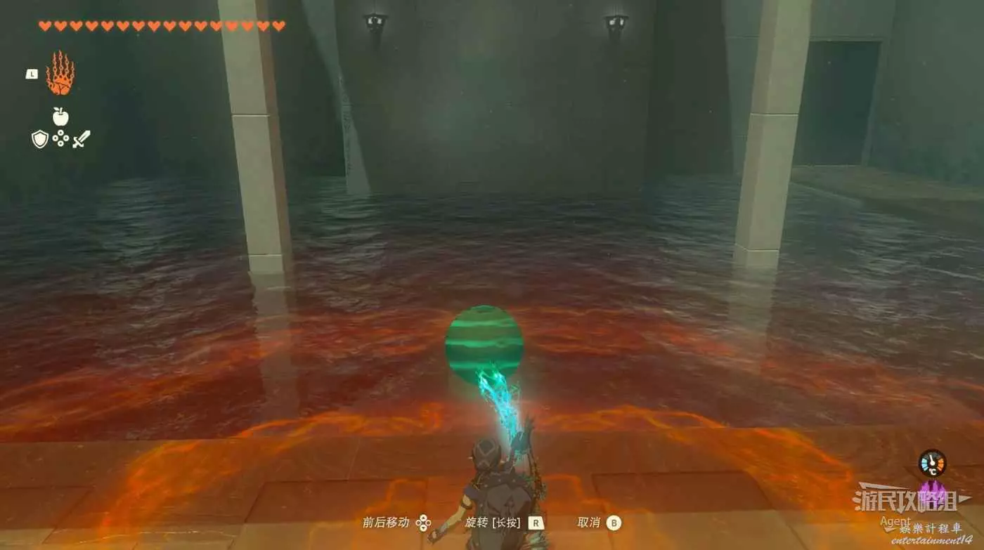 神廟旁的岩漿上方有寶箱,噴水造石板或者放個滑翔翼,用通天術上去開寶箱,拿到【防具】左納尼烏姆之前掛。