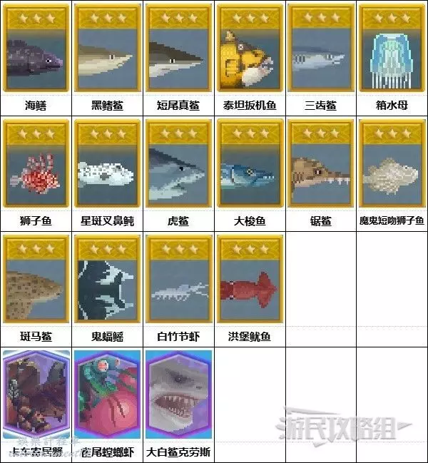 注意:卡車寄居蟹、雀尾螳螂蝦和大白鯊是暴風雨之夜才會出現的BOSS,通常夜晚不會出現在海裡。