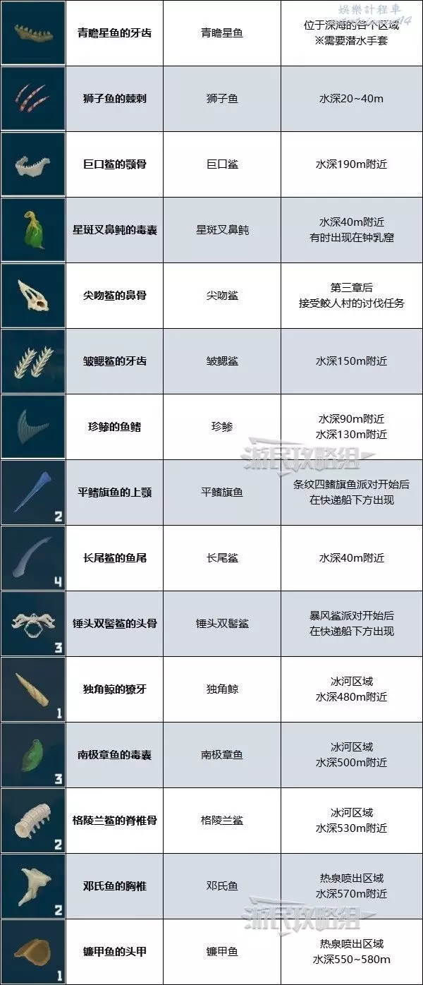 潛水員戴夫 (DAVE THE DIVER) 強化材料獲取方法一覽 13 7 月 2023-07-13 廣告 作者:瑞破受氣包 來源:遊民星空 建議提前收集使用頻率較高的素材 許多種類的武器強化都需要三齒鯊&虎鯊的牙齒、兜水母的發電器官、星斑叉鼻魨的毒囊、烏賊的皮膚碎片等,所以建議只要遇到就開始著手收集。遇到不想強化的屬性的話就沒必要全部收集。 部分素材只能在特定時期獲取 例如石紋電鰩的發電板只能在特定環境下出現,或者一些BOSS材料只能在BOSS戰中獲取,如果想要強化特定武器的話,要注意這一點。