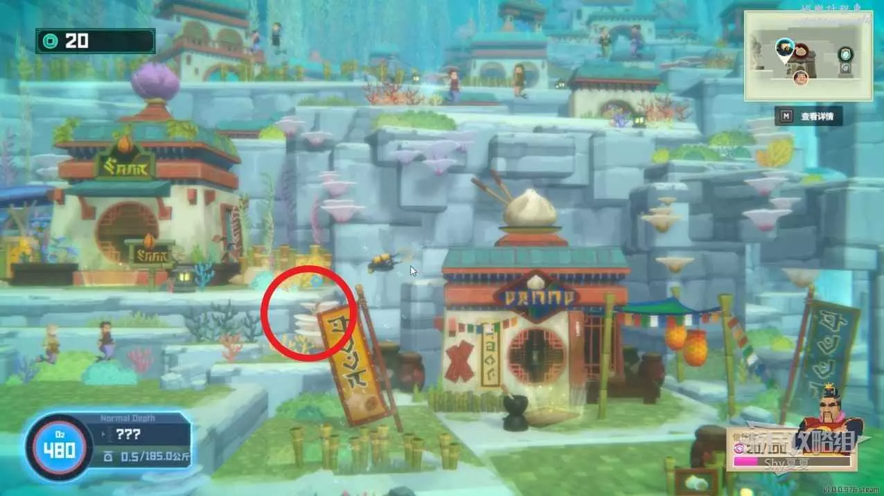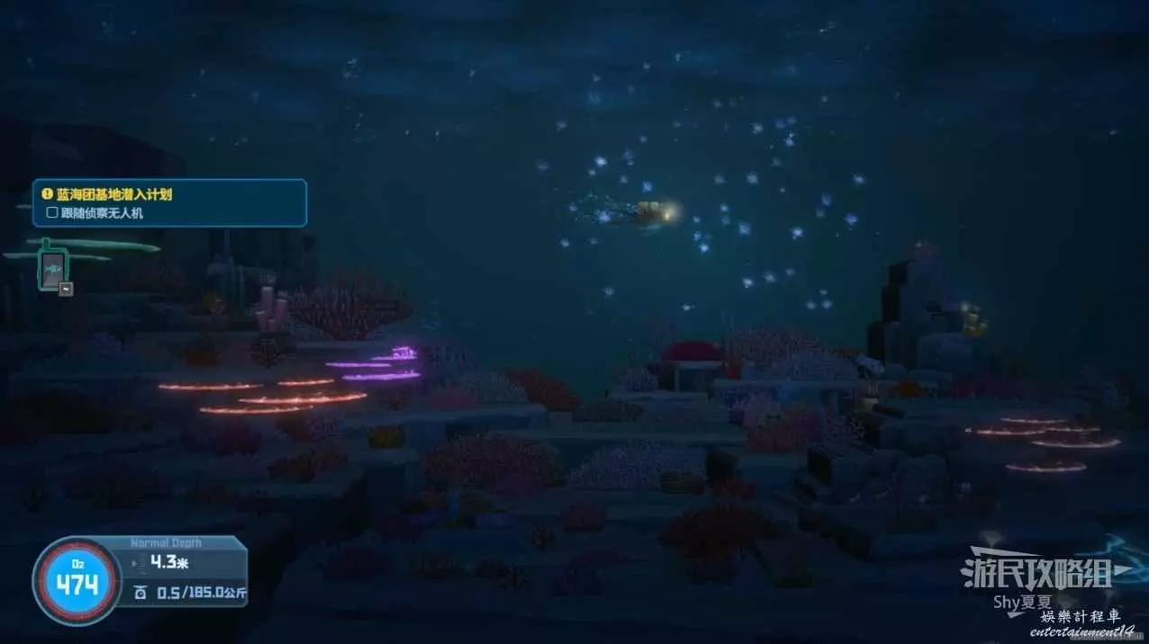 夜晚壽司店歇業後,下潛進入藍海團基地,需要跟蹤無人機,不能離太近,會被發現,也不能太遠,儘量讓無人機在螢幕邊緣移動就是相對安全的。