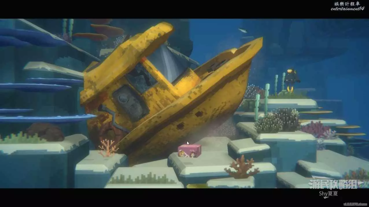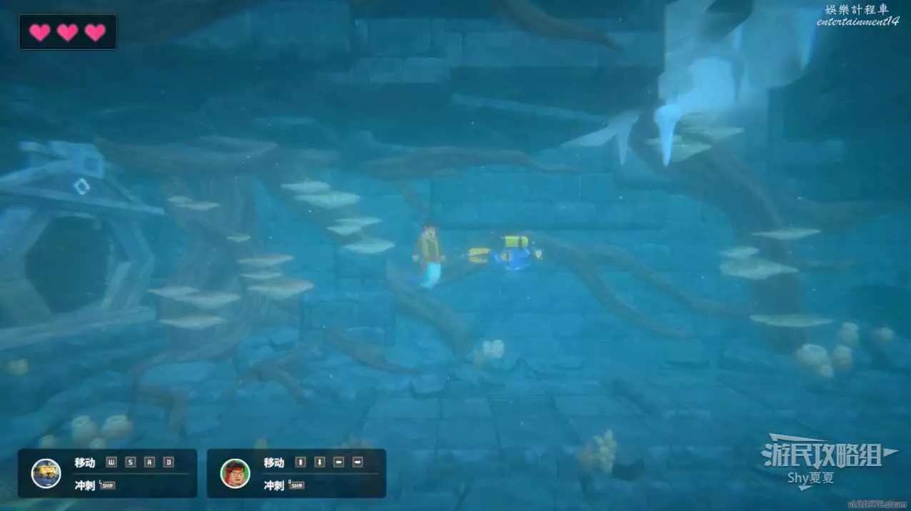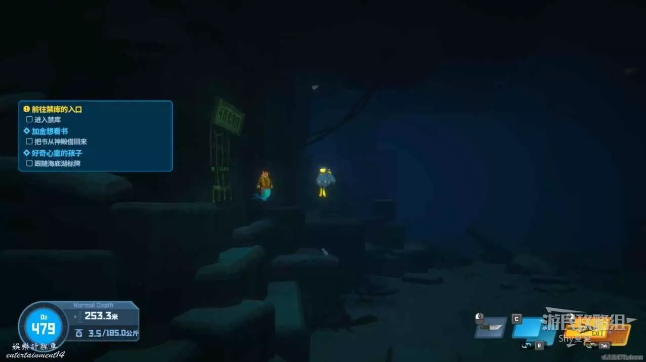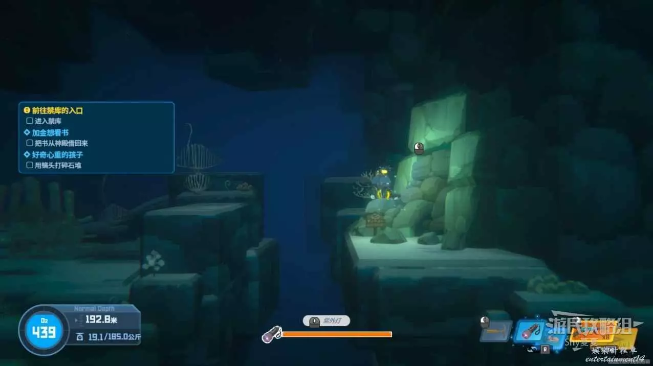 進入深海,會看到標牌,跟著牌子走就能到達湖底洞,湖底洞附近有黃色箱子,打開可以獲得鎬子,用鎬子鑿開石頭進入洞內。