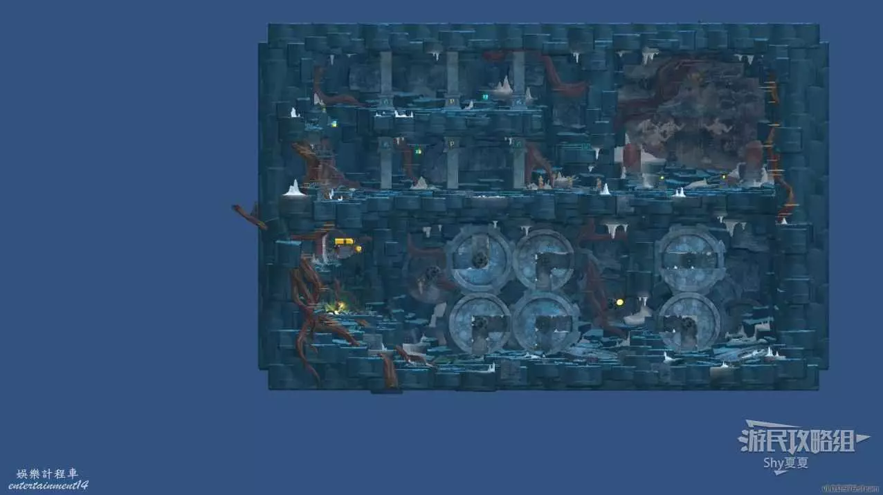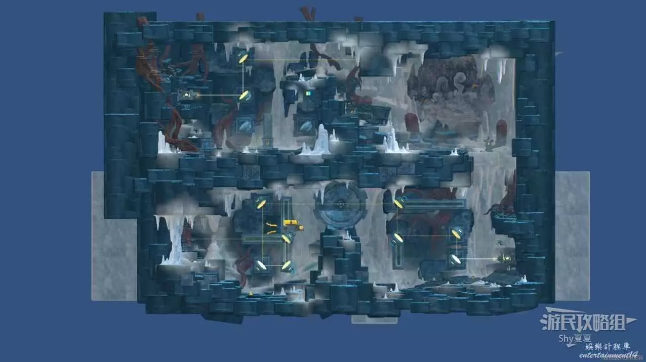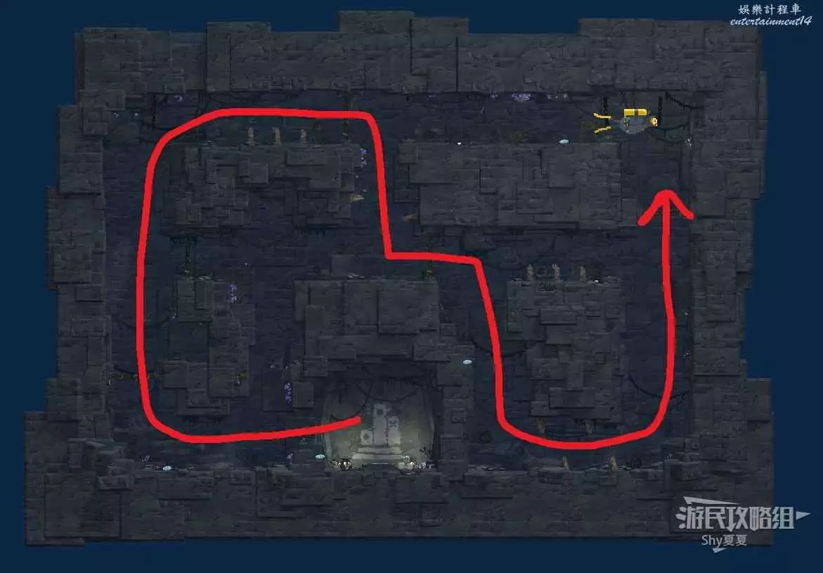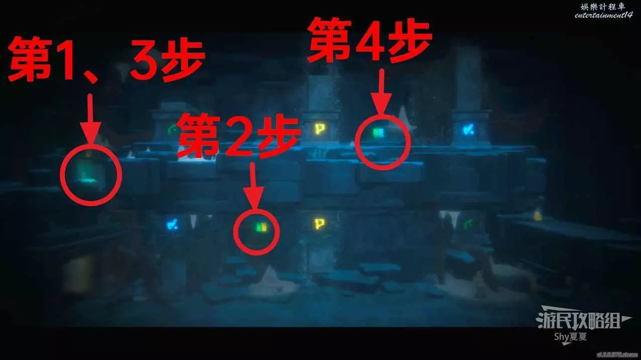 進入洞穴後一直往右走,來到下圖的裝置下,將上方裝置調整為下圖的樣子即可。