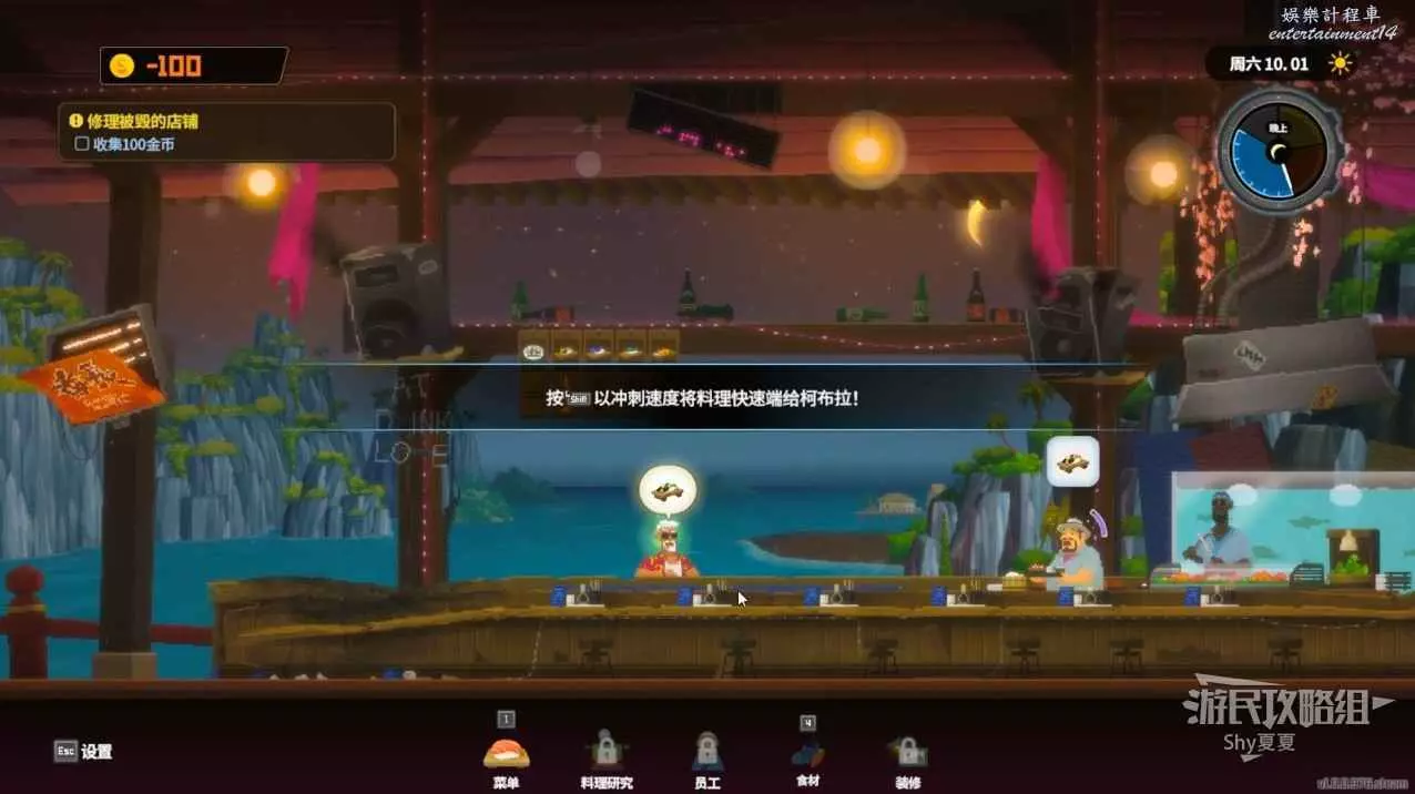 芳慧剛來的時候是做不出這個料理的(除非你提前打過鯊魚)。完成店鋪運營後,去下水獵鯊。使用步槍獵殺鯊魚然後剝皮即可。晚上講全烤三齒鯊頭上給芳慧即可完成任務,並解鎖員工招募功能。