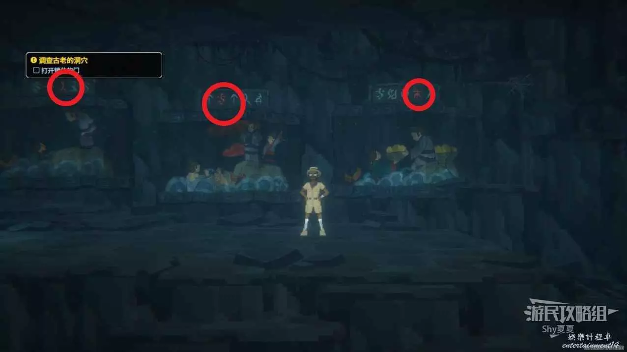操作班喬進入洞穴,第一個解謎需要對應壁畫上紅色的標誌。